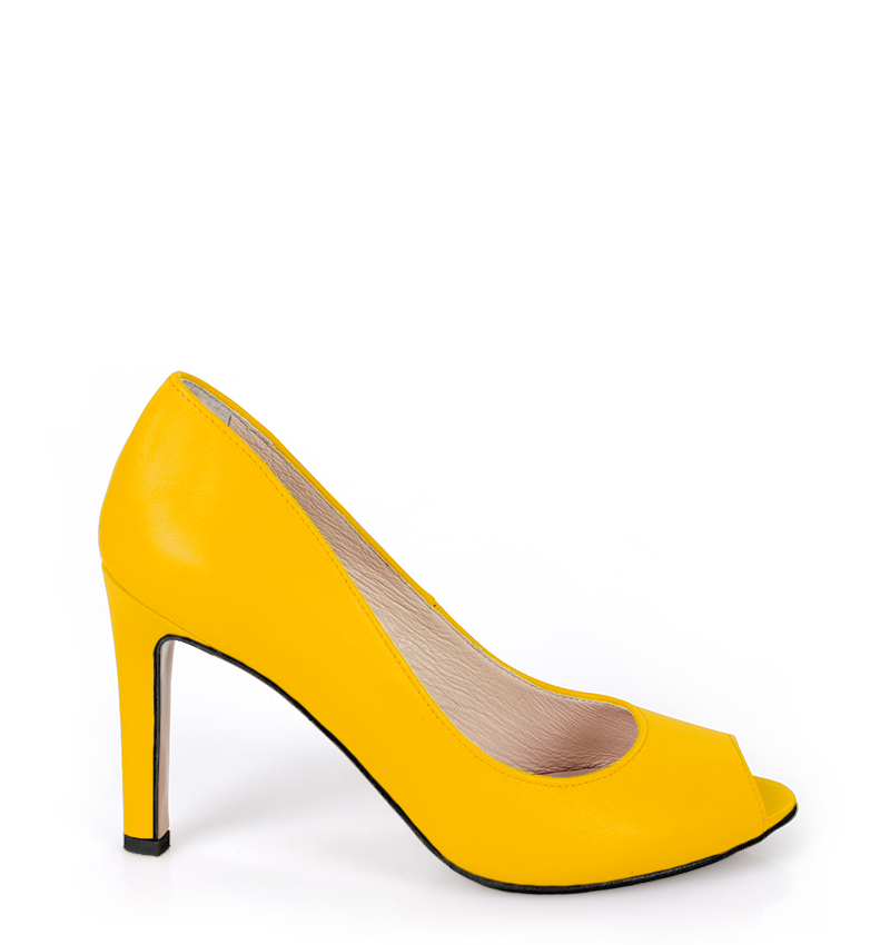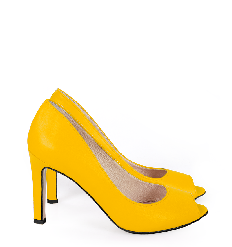 AGATE – Żółte szpilki z odkrytym palcem w kolorze intensywnym żółtym, na 9,5 cm obcasie (wysokość obcasa jest mierzona w rozmiarze 37). Otwarte szpilki open-toe na wysokiej grubości stabilnej szpilce. Buty wykonane z naturalnej skóry licowej układającej się do stopy. Tęgość butów to F 1/2. Żółte czółenka na wysokim obcasie mogą stanowić uzupełnienie codziennych kreacji oraz stanowić kolorowy dodatek do sukni ślubnych.