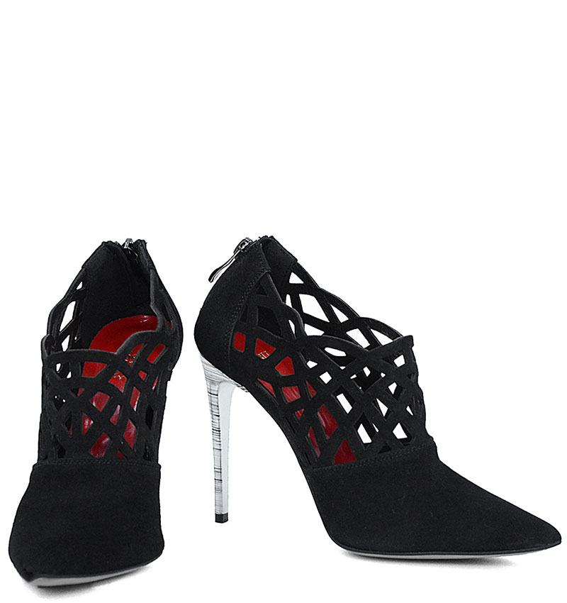 AMELIA – Czarne botki letnie na srebrnej szpilce, wykonane z naturalnej skóry welurowej. Obcas 10,5 cm (wysokość obcasa jest mierzona dla rozmiaru 37). Eleganckie botki letnie do kostki, stylowe ażurowe wycięcia dodają lekkości botkom. Tęgość butów to F 1/2. Wnętrze wykończone delikatną skórą naturalną.