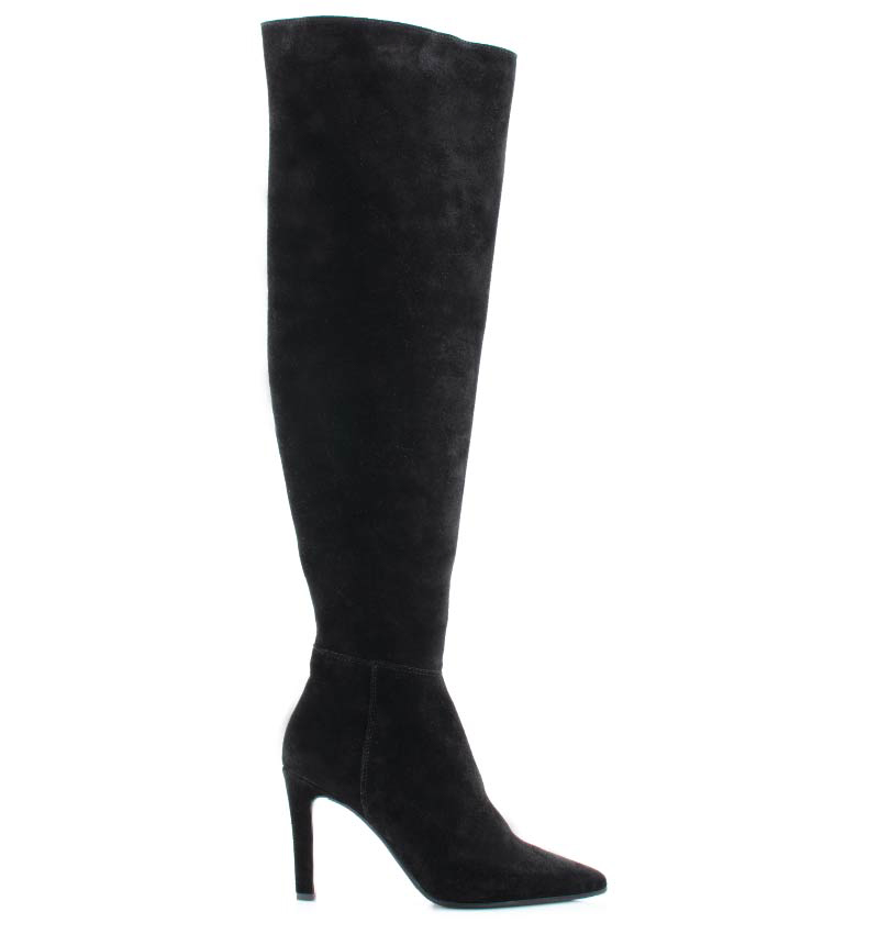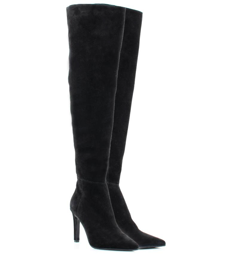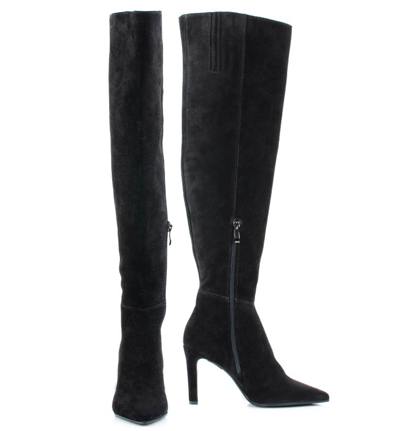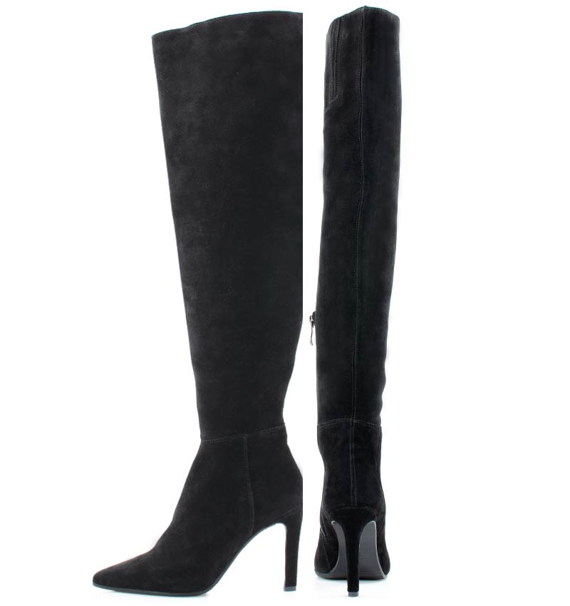 ASTRID – czarne kozaki za kolano na wysokiej 9,5 cm szpilce. Wymiary: obwód cholewki w łydce – 40 cm, obwód cholewki u samej góry – 45, wysokość cholewki – 58 cm, (mierzona z tyłu od końca obcasa w górę). Kozaki zapinane na zamek. Cholewka wykonana z naturalnej skóry welurowej układającej się do stopy. Tęgość butów: F 1/2. Wnętrze butów nieocieplone – wykończone skórą naturalną licową