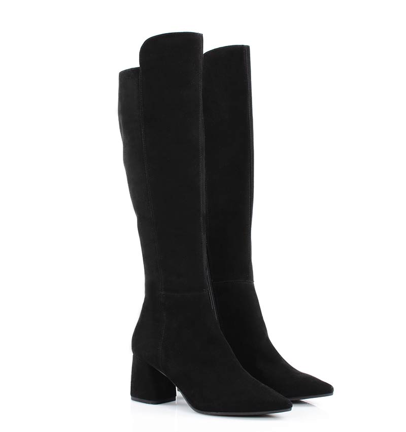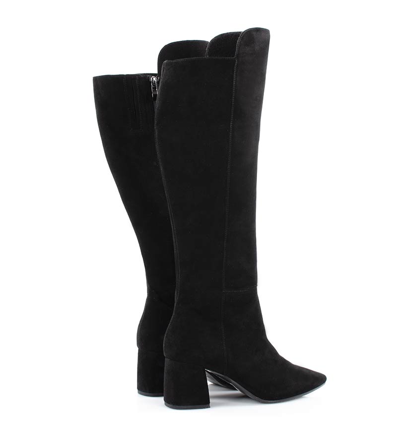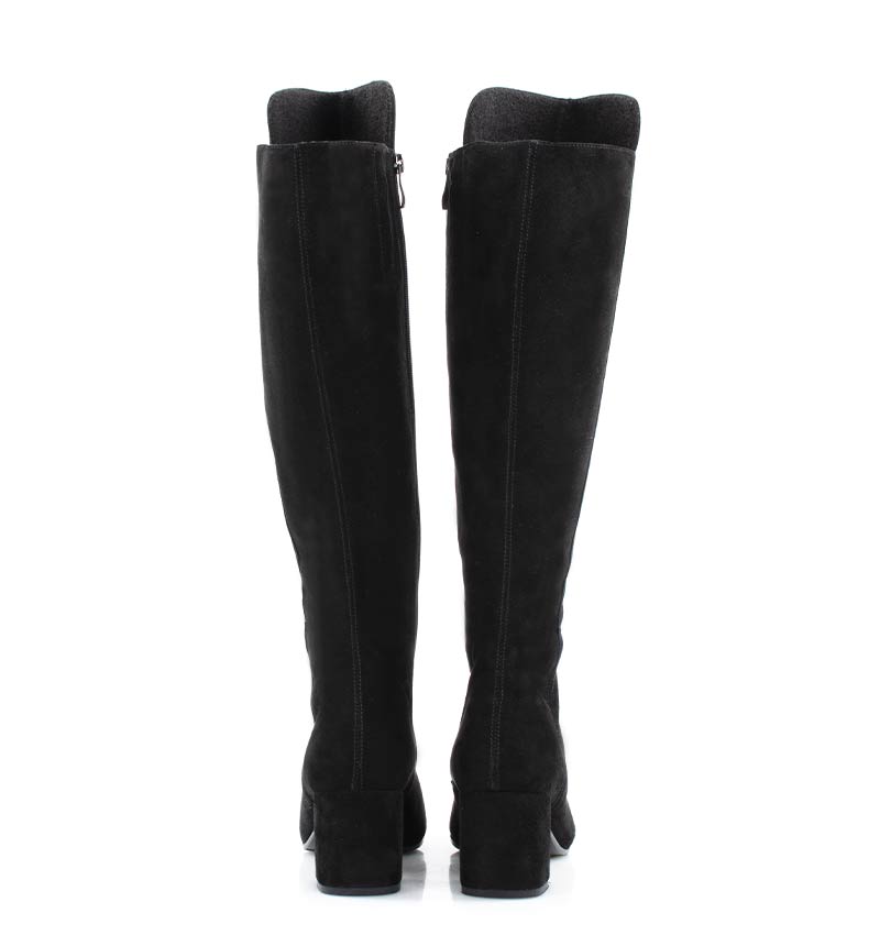 BARB – Czarne kozaki za kolano, na szerokim słupku. Średniej wysokości 6,5 cm obcas (wysokość obcasa jest mierzona w rozmiarze 37).