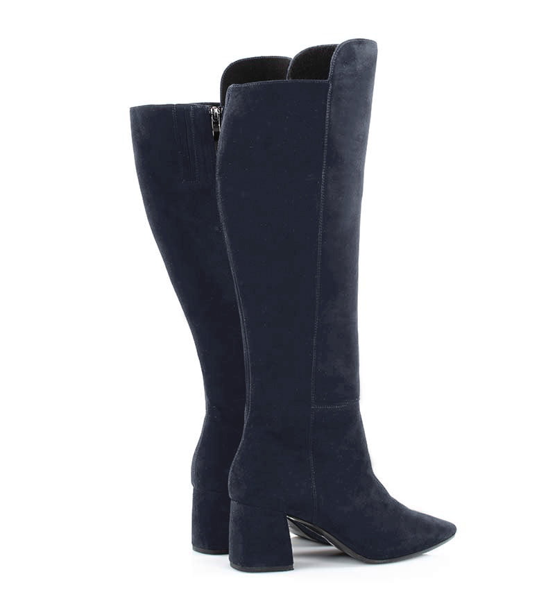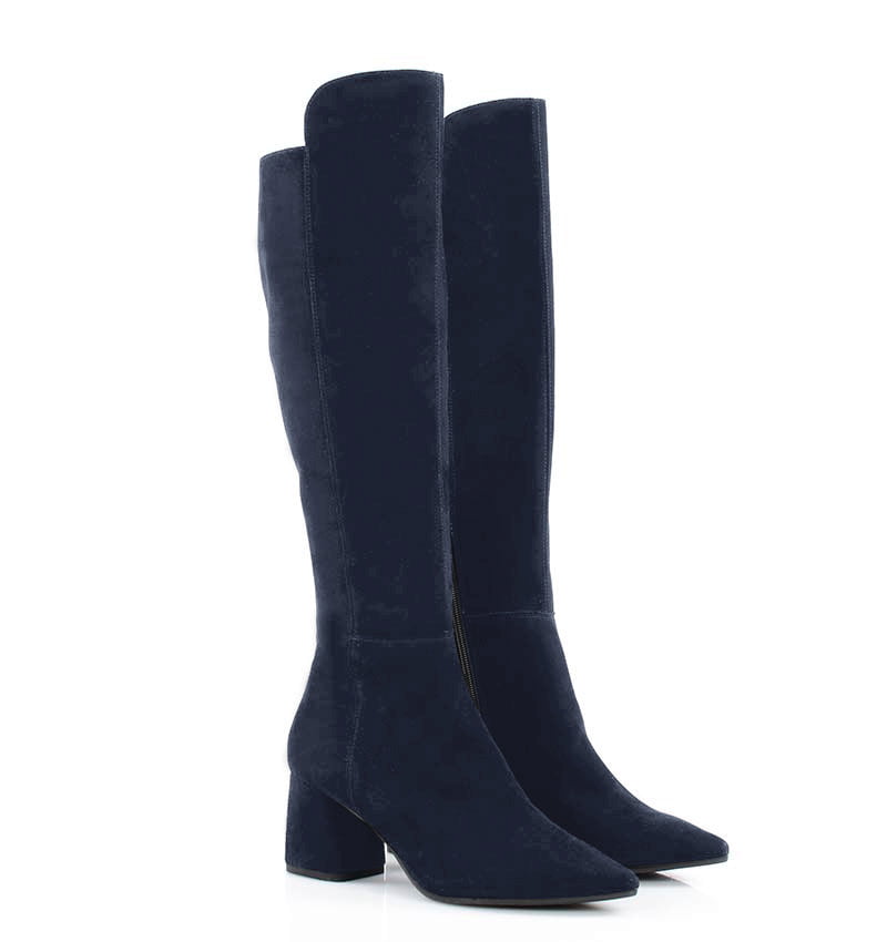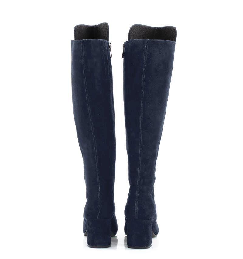 BARB – Granatowe kozaki za kolano, na szerokim słupku. Średniej wysokości 6,5 cm obcas (wysokość obcasa jest mierzona w rozmiarze 37). Czubek w szpic, zapinane na zamek . Cholewka z dłuższym, zakrywającym kolano przodem, wykonana z zamszowej skóry naturalnej (o wysokości 43 cm mierząc z tyłu od obcasa). Średnia wysokość obcasa sprawia, że są to wygodne kozaki. Tęgość butów: F 1/2. Kozaki ocieplone kocem obuwniczym, dzięki czemu będą idealne na sezon jesienno-zimowy.