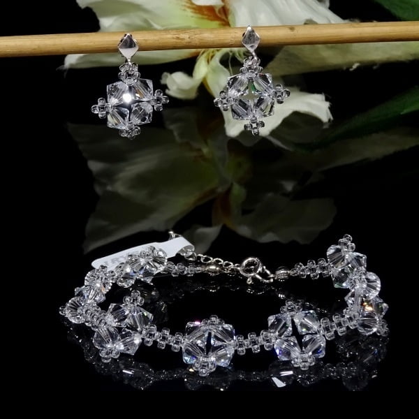 Bransoletka –wykonana z kryształów Precioso oraz japońskich koralików Toho w kolorze crystal oraz srebra pr 925. Doskonały dodatek ślubny i wieczorowy. Wraz z kolczykami stanowią niepowtarzalny komplet biżuterii ślubnej.