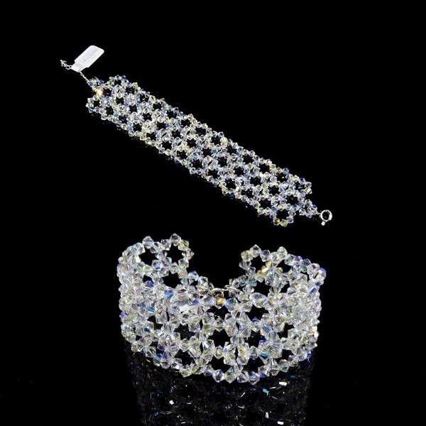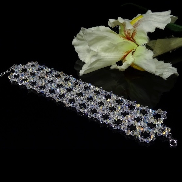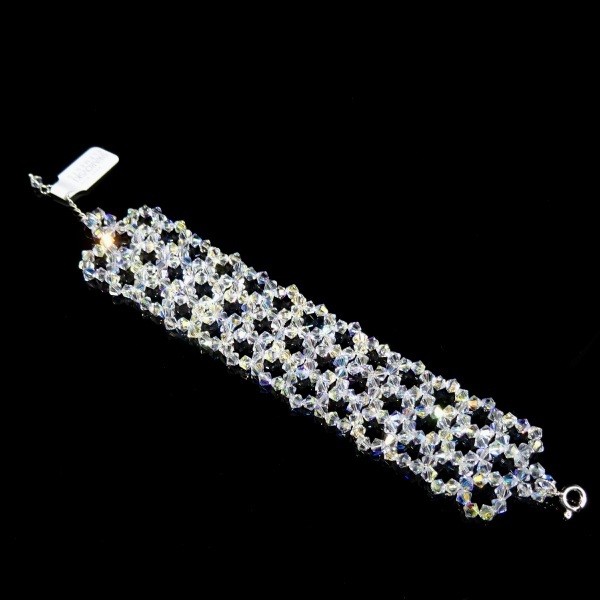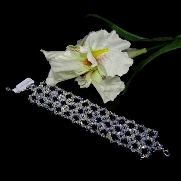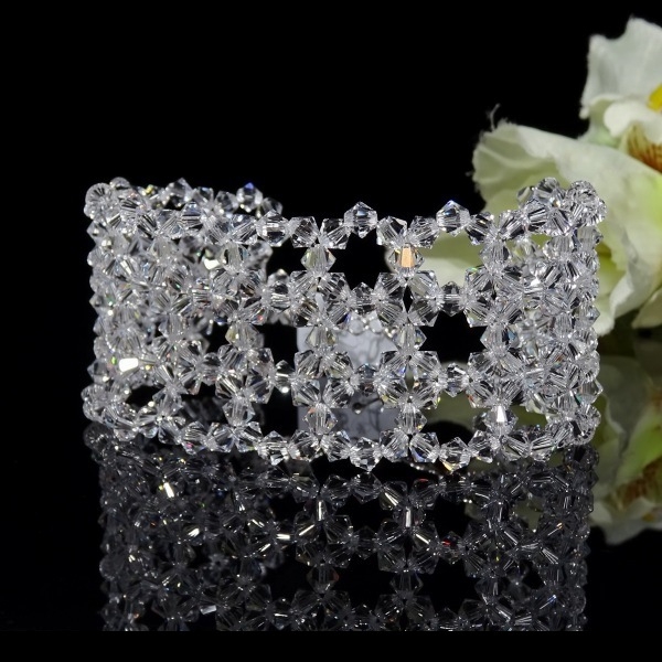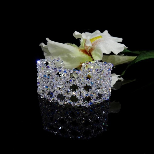 Bransoletka – szeroka na 3,4 cm, wykonana z kryształów Precioso oraz srebra rodowanego pr. 925. Doskonały dodatek ślubny i wieczorowy.