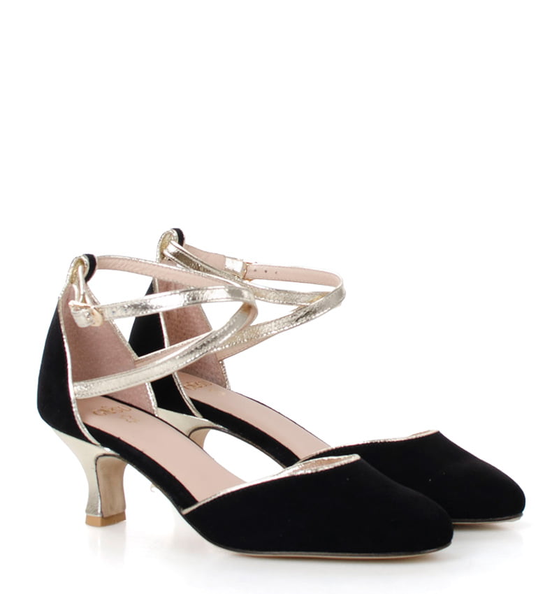 CARMEN – Czółenka czarne ze złotą lamówką, na stabilnym obcasie 5,5 cm (wysokość obcasa jest mierzona dla rozmiaru 37). Buty dedykowane do tanga i milongi, choć chętnie kupowane również jako wygodne buty na wesele. Podeszwa skórzana ze skóry obuwniczej, dzięki czemu jest elastyczna i trwała. Carmen to wygodne buty do tańca oraz ze względu na średni obcas są to również dobre buty do ćwiczeń, w których można chodzić na zewnątrz po suchej powierzchni (bez strachu, że się uszkodzą). Cholewka wykonana z zamszowej skóry naturalnej. Czółenka zapinane paskami na krzyż w podbiciu.