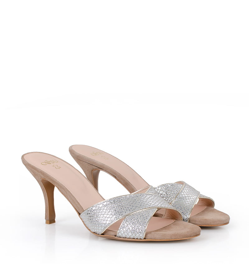 CHRISTINA – Srebrne klapki na szpilce. Cholewka w postaci dwóch skrzyżowanych, szerokich pasków ze złotą lamówką. Wykonane ze skóry naturalnej. Wysokość obcasa 7,5 cm jest mierzona w rozmiarze 37.  Średniej wysokości szpilka sprawia, że klapki są wygodne. Tęgość butów: F1/2. Wnętrze butów i wkładka wykonane są również ze skóry naturalnej.