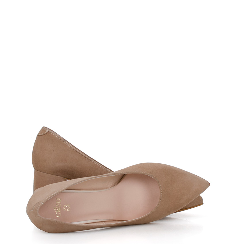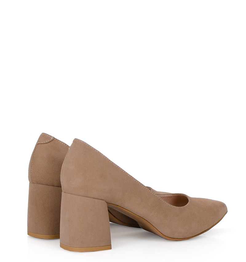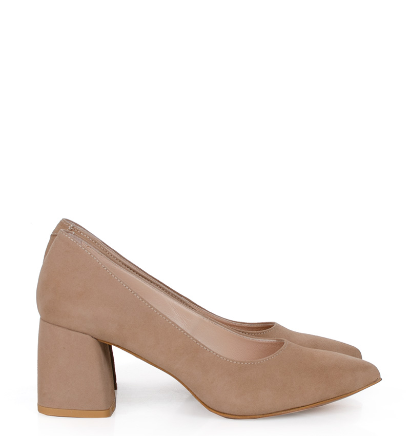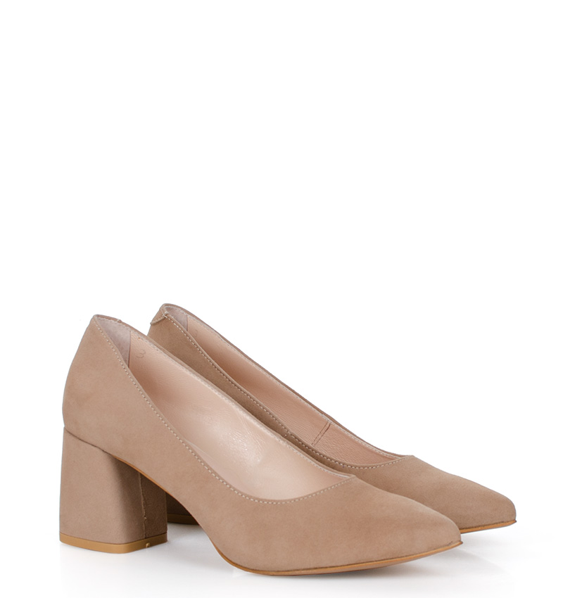 CLARA – Beżowe czółenka na 6,5 cm słupku (wysokość obcasa jest mierzona w rozmiarze 37). Czubek w szpic. Buty wykonane z naturalnej skóry zamszowej. Średnia wysokość szerokiego obcasa sprawia, że są to bardzo wygodne szpilki do codziennego użytku. Tęgość butów: F 1/2. Wnętrze butów i wkładka wykonane są ze skóry naturalnej.