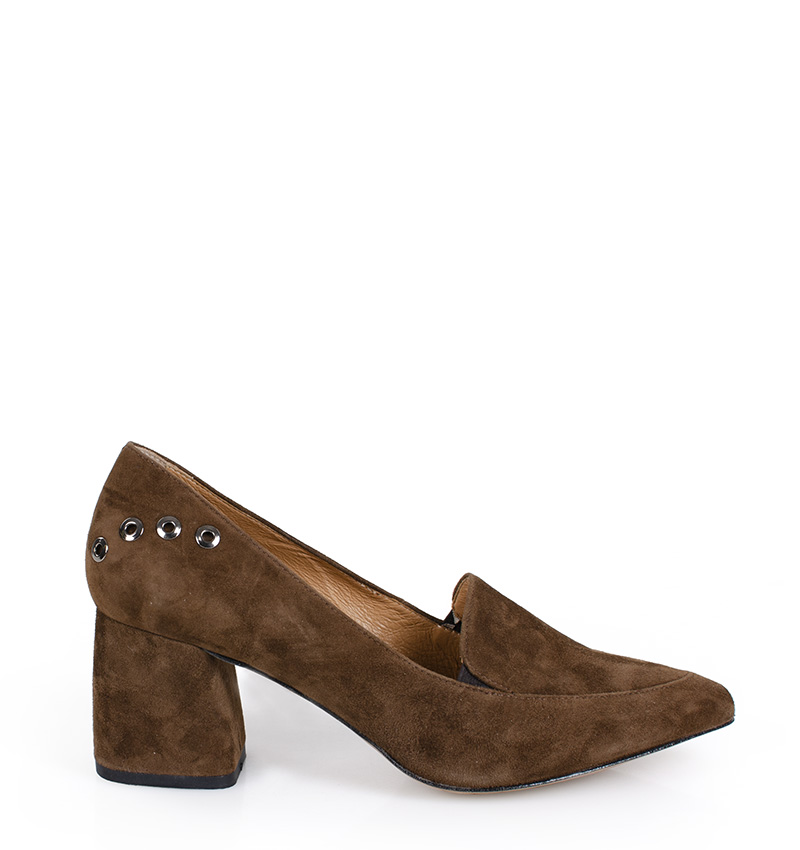 CONSTANCE – Brązowe czółenka na 6,5 cm obcasie (wysokość obcasa jest mierzona w rozmiarze 37), stylizowane na mokasyny. Czubek w szpic. Buty wykonane z naturalnej skóry zamszowej. Średnia wysokość szerokiego obcasa sprawia, że są to bardzo wygodne szpilki do codziennego użytku. Tęgość butów: F 1/2. Wnętrze butów i wkładka wykonane są ze skóry naturalnej.