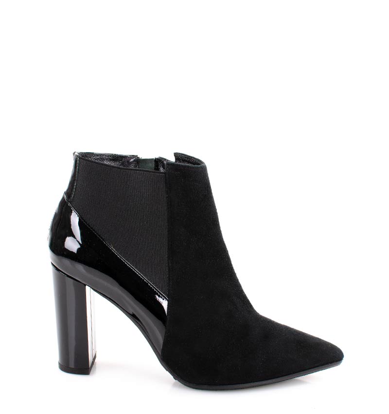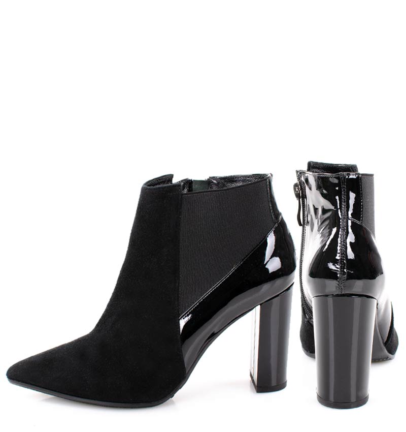 VERA – Czarne botki na 9 cm słupku (wysokość obcasa jest mierzona w rozmiarze 37). Czubek w szpic, zapinane na zamek. Cholewka wykonana z dwóch rodzajów skór naturalnych. Przód butów to skóra welurowa, tył butów to skóra lakierowana. Stabilny obcas, sprawia, że są to wygodne botki na słupku. Tęgość butów: G. Wnętrze butów nie jest ocieplone i wykończone skórą naturalną.