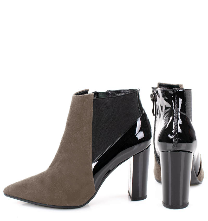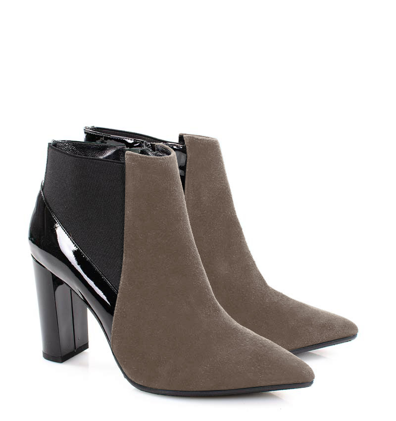 VERA – Ciemno beżowe botki na 9 cm słupku (wysokość obcasa jest mierzona w rozmiarze 37). Czubek w szpic, zapinane na zamek. Cholewka wykonana z dwóch rodzajów skór naturalnych. Przód butów to skóra welurowa, tył butów to skóra lakierowana. Stabilny obcas, sprawia, że są to wygodne botki na słupku. Tęgość butów: G. Wnętrze butów nie jest ocieplone i wykończone skórą naturalną.