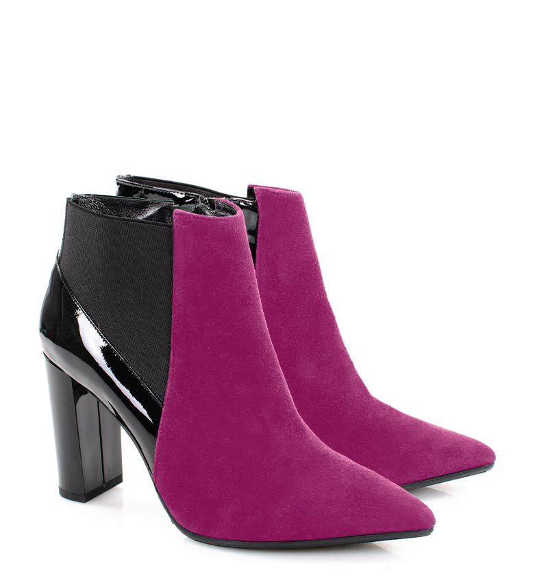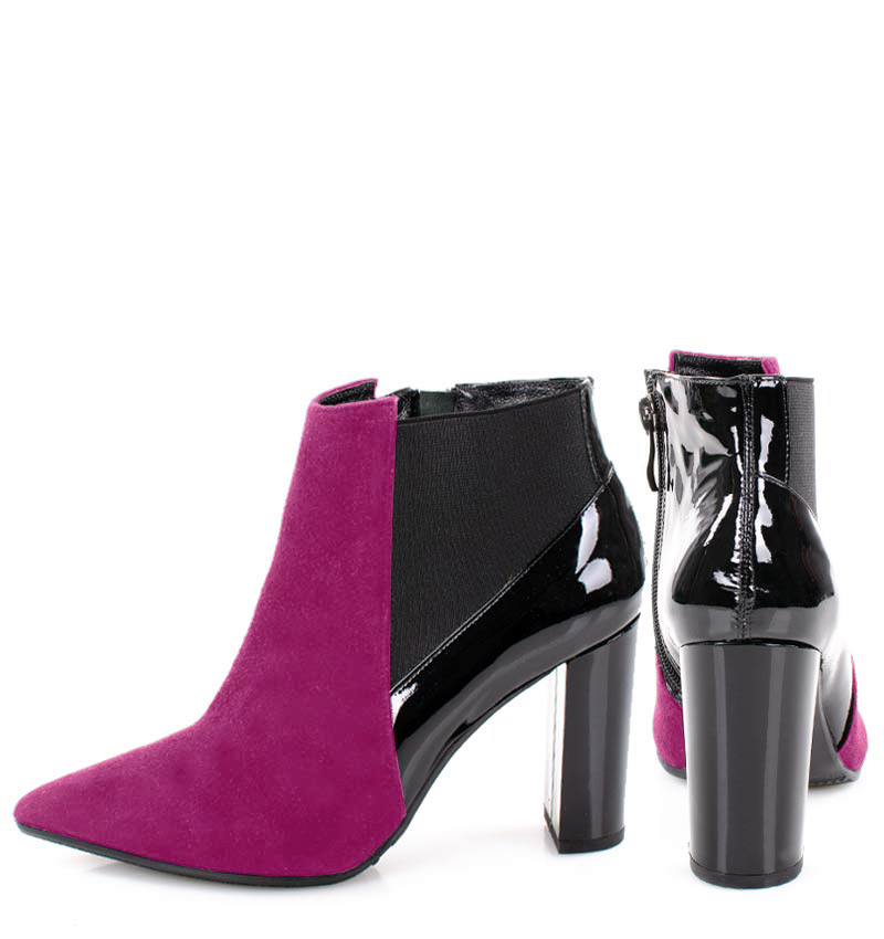 VERA – Różowe botki na 9 cm słupku (wysokość obcasa jest mierzona w rozmiarze 37). Czubek w szpic, zapinane na zamek. Cholewka wykonana z dwóch rodzajów skór naturalnych. Przód butów to skóra welurowa, tył butów to skóra lakierowana. Stabilny obcas, sprawia, że są to wygodne botki na słupku. Tęgość butów: G. Wnętrze butów nie jest ocieplone i wykończone skórą naturalną.