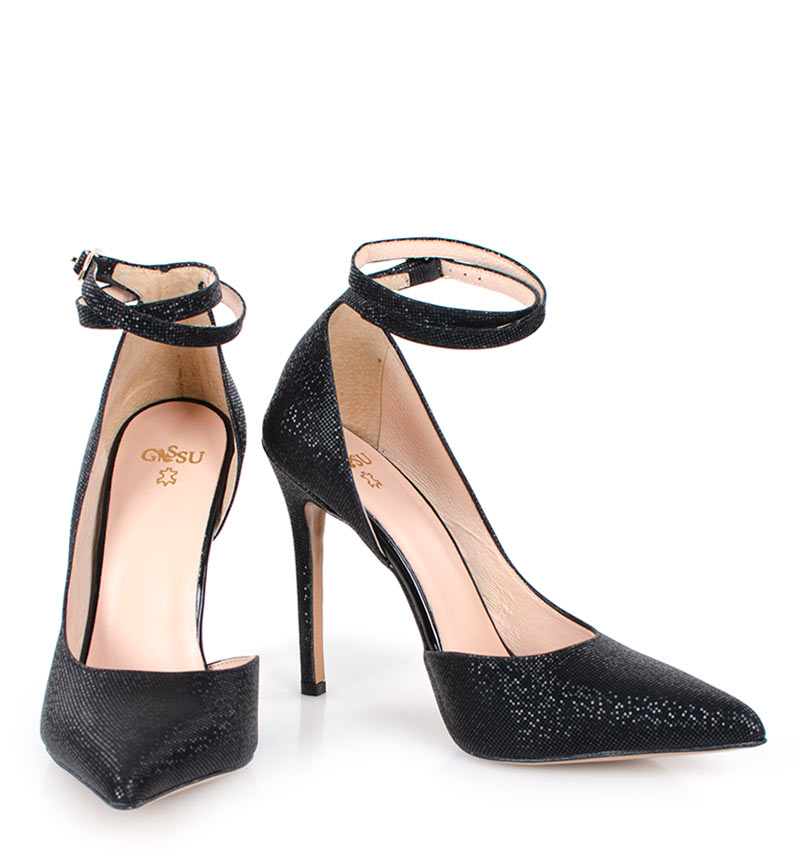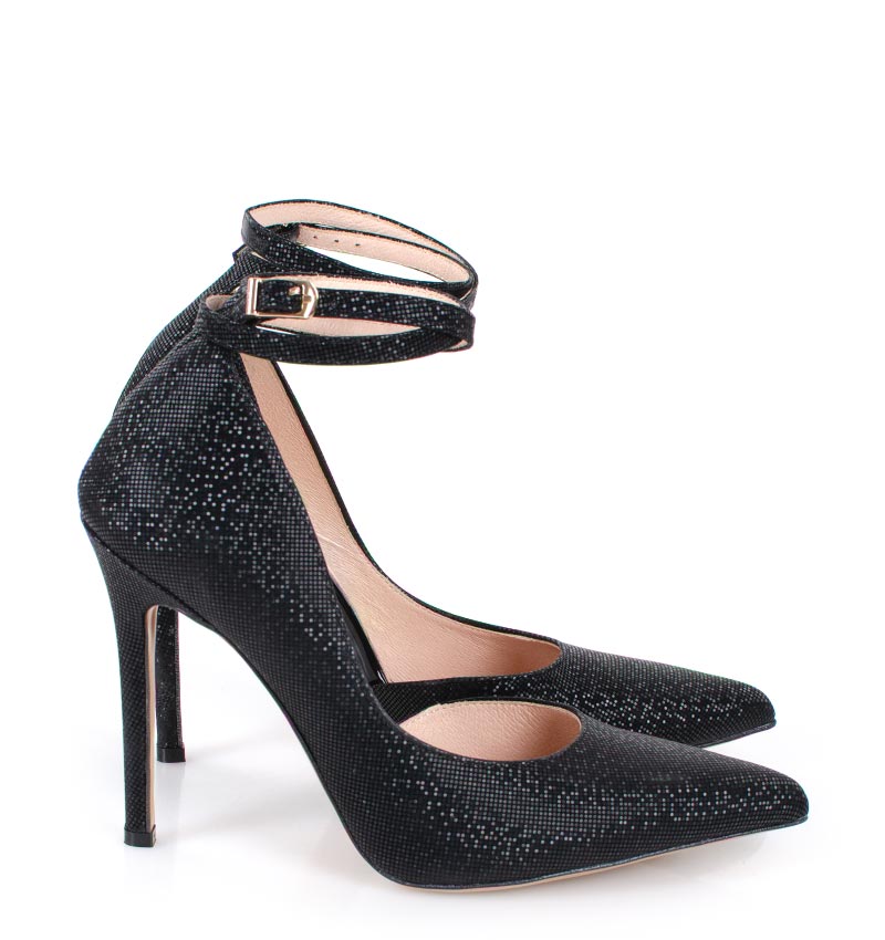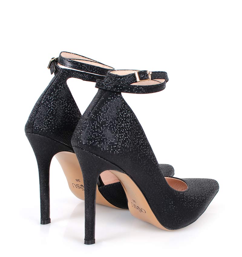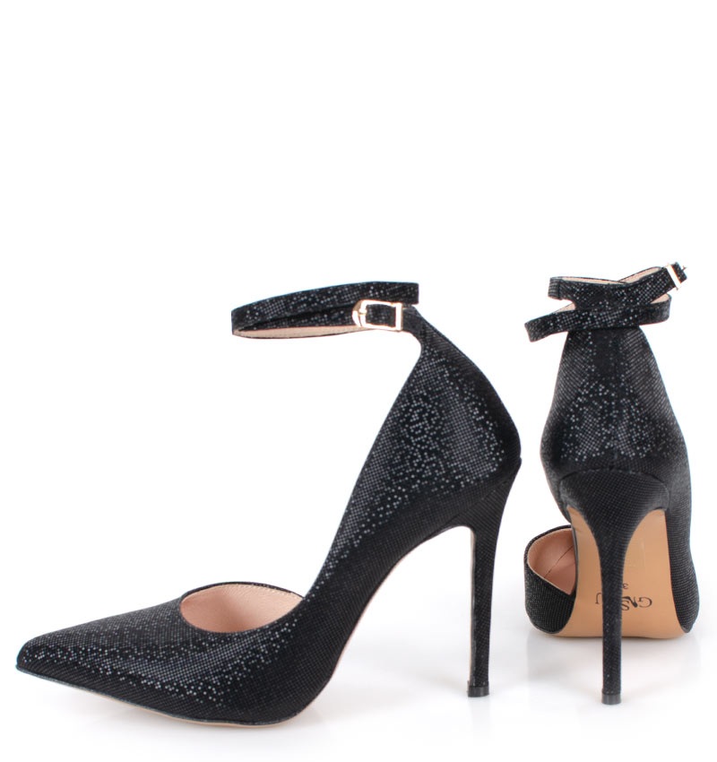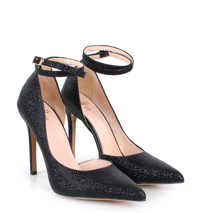 DENISE – Czarne wysokie szpilki, wykonane ze skóry naturalnej strukturalnej. Nad kostką cienki pasek oplatający nogę, zapinany złotą sprzączką. Smukła, wysoka, bo aż 11 cm szpilka i delikatne wycięcie cholewki po wewnętrznej stronie to cech charakterystyczne tego modelu. Tęgość butów: F 1/2. Wnętrze butów i wkładka wykonane są ze skóry naturalnej.