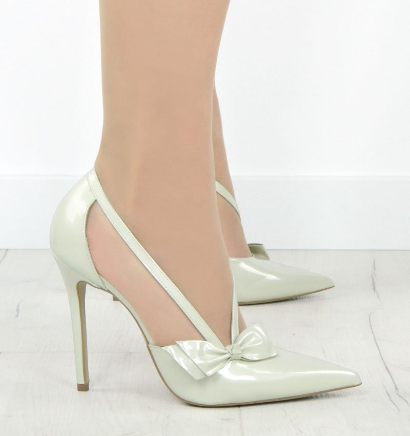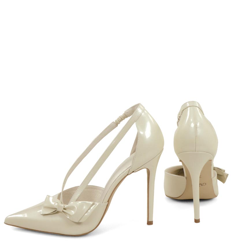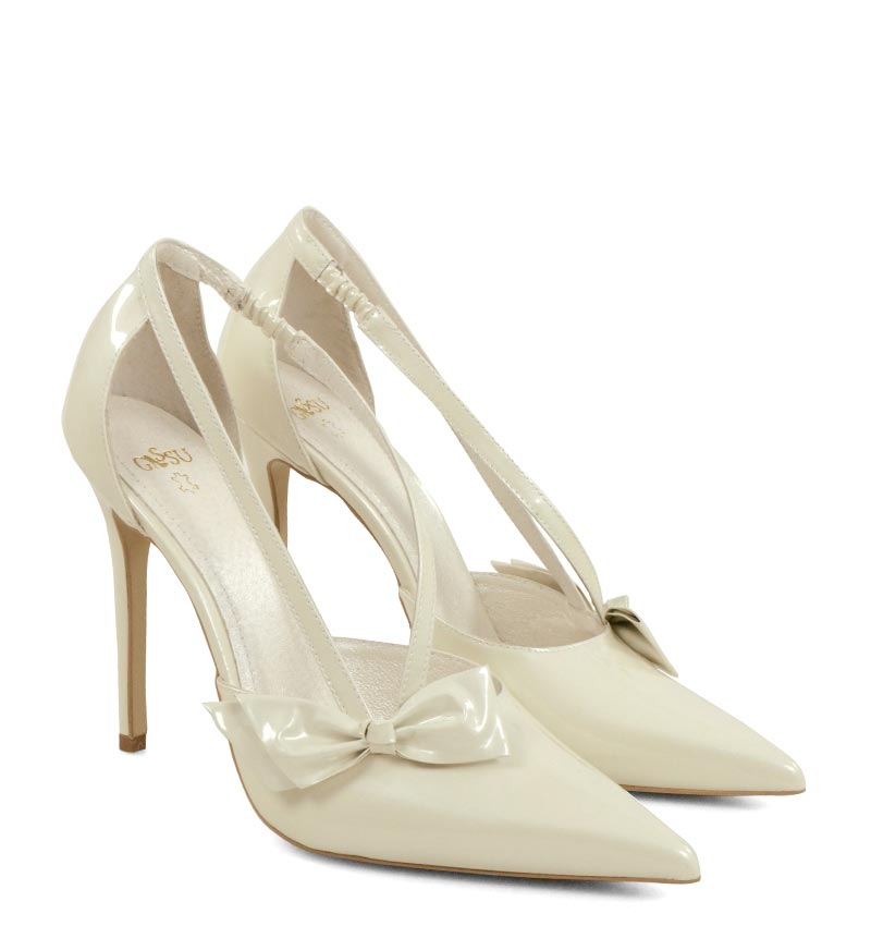 Ecru perła szpilki z kokardą na wysokim obcasie.