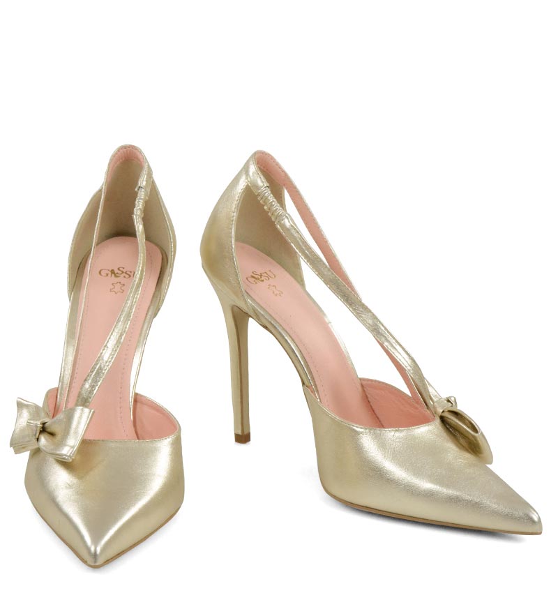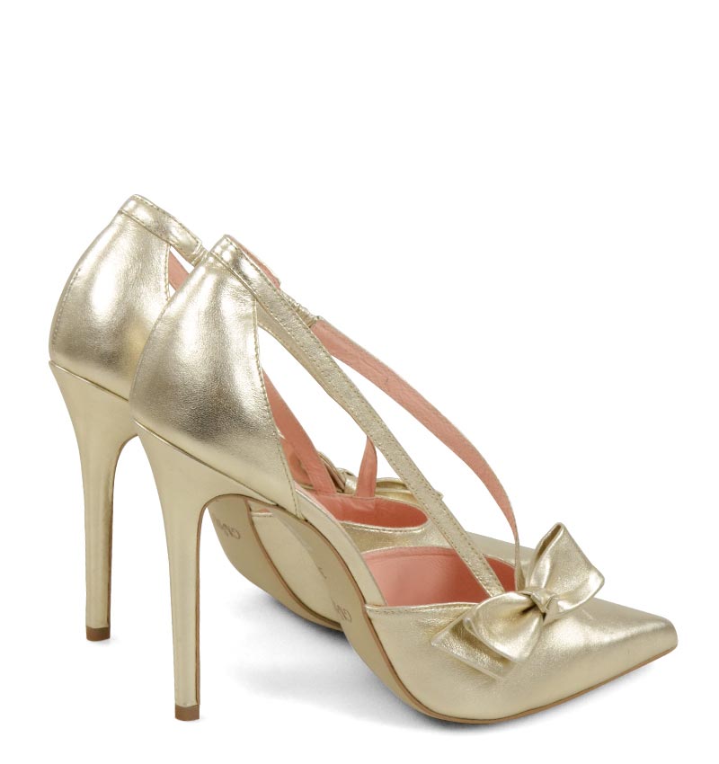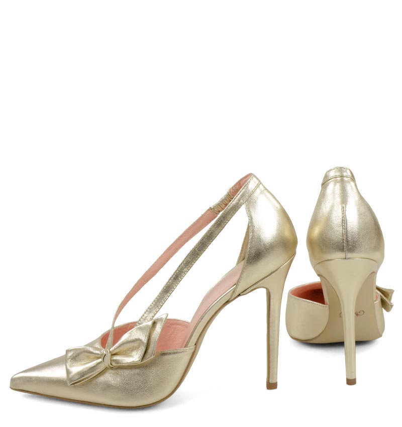 EMMA – Złote wysokie szpilki z odkrytą środkową częścią stopy. Szpilki z kokardą na czubku. Wysokość obcasa 11 cm jest mierzona w rozmiarze 37. Wysoka szpilka sprawia, że szpilki wyglądają efektownie. Tęgość butów: F1/2. Skórzane szpilki wykonane ze skóry naturalnej. Wnętrze butów i wkładka wykonana z koziej skóry.