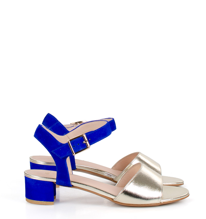 Te złoto-niebieskie sandałki na niskim obcasie wykonywane są ręcznie, dzięki czemu istnieje możliwość indywidualnego dostosowania sandałek do nietypowych stóp.