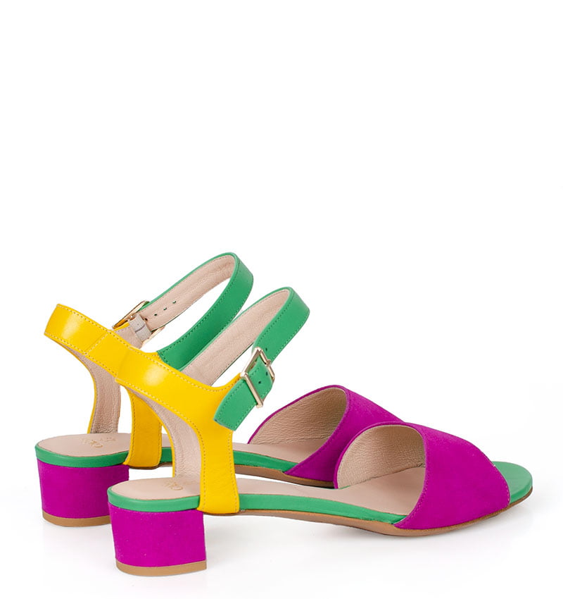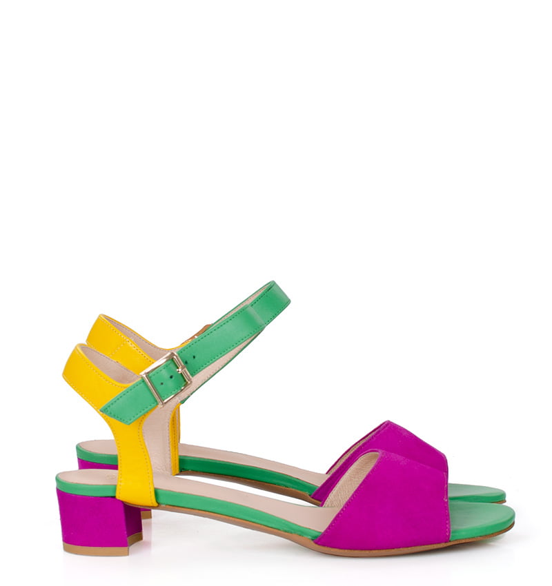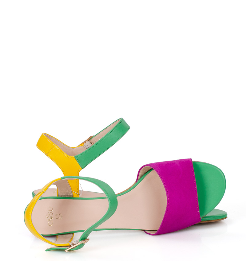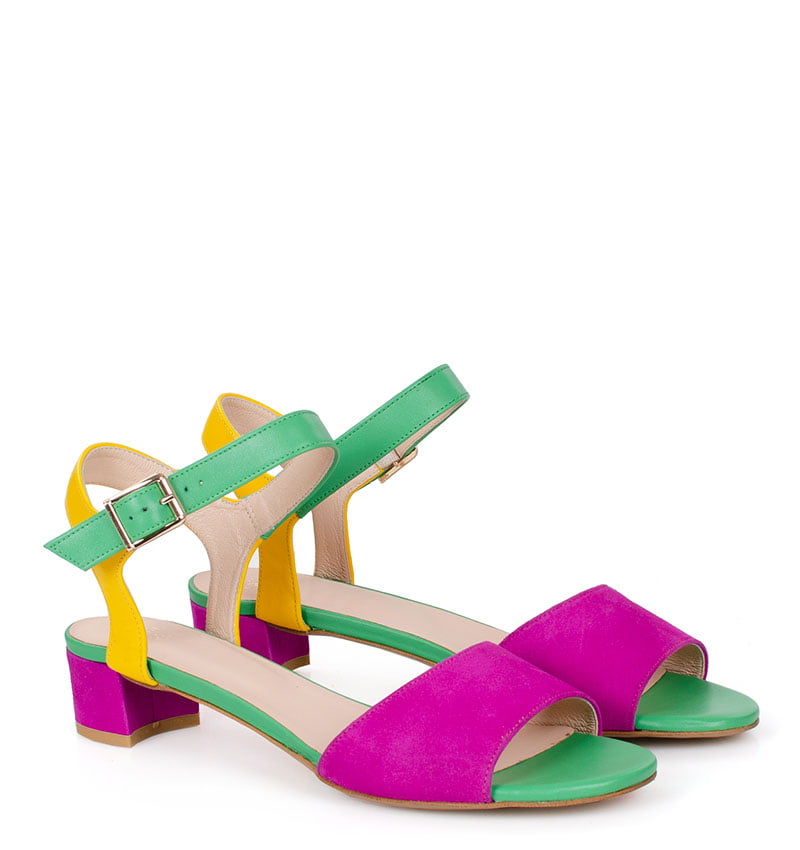 Te kolorowe sandałki na niskim obcasie wykonywane są ręcznie, dzięki czemu istnieje możliwość indywidualnego dostosowania sandałek do nietypowych stóp
