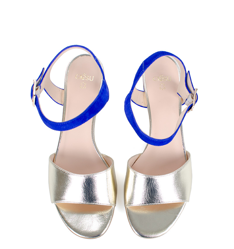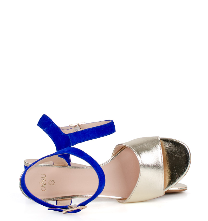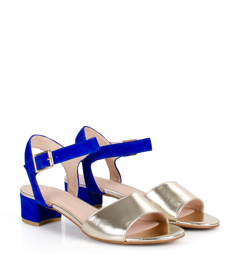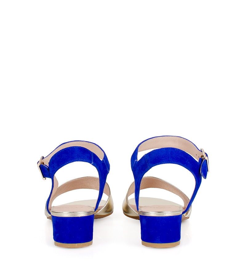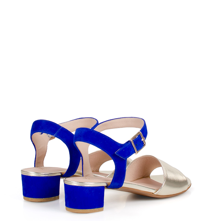 Te złoto-niebieskie sandałki na niskim obcasie wykonywane są ręcznie, dzięki czemu istnieje możliwość indywidualnego dostosowania sandałek do nietypowych stóp.