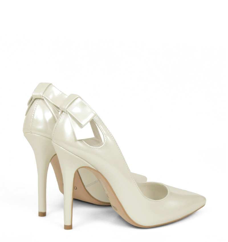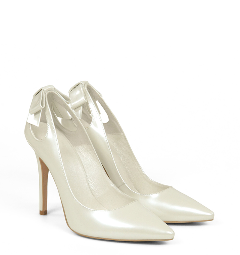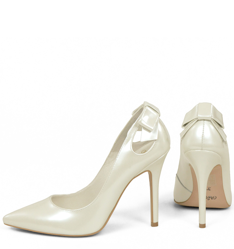 EVIE – Ecre wysokie szpilki z wycięciami po bokach pięty, które zwieńczone zostały uroczą kokardką. Wysokość obcasa 11 cm jest mierzona w rozmiarze 37). Cholewka wykonana z naturalnej skóry perłowej. Wnętrze butów i wkładka wykonane są ze skóry naturalnej. Tęgość butów: F 1/2