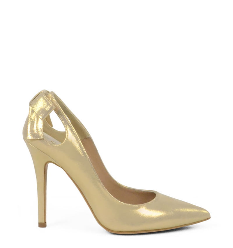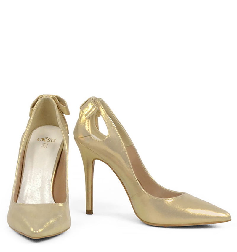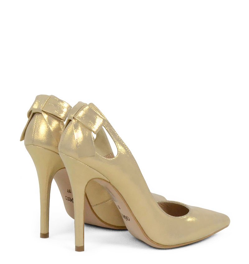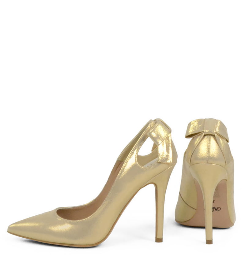 EVIE – Złote wysokie szpilki z wycięciami po bokach pięty, które zwieńczone zostały uroczą kokardką. Wysokość obcasa 11 cm jest mierzona w rozmiarze 37). Cholewka wykonana z naturalnej skóry satynowej. Wnętrze butów i wkładka wykonane są ze skóry naturalnej. Tęgość butów: F 1/2
