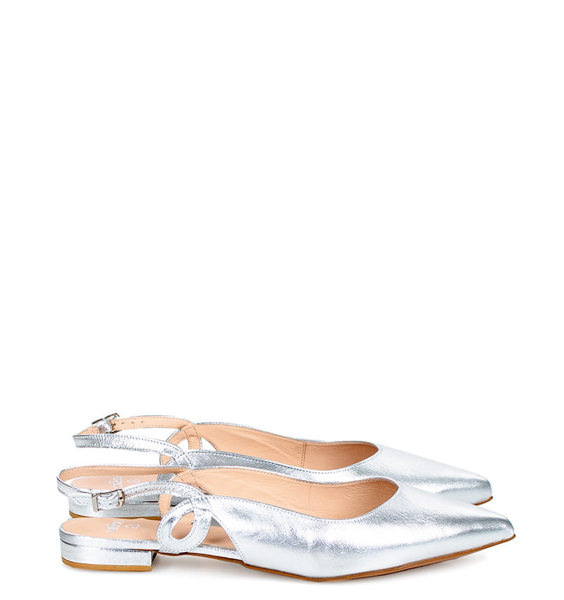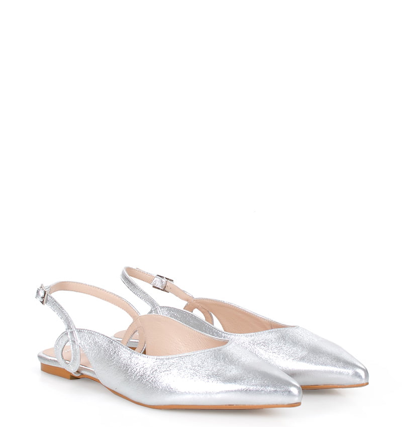 FIONA – Srebrne baleriny z licowej skóry, z odkrytą pietą. Płaski obcas o wysokości 0,5 cm w rozmiarach do 41 oraz 1 cm w rozmiarach większych (obcas obciągany skórą). Wygodne letnie baleriny zapinane na klamerkę na pięcie. Buty wykonane z naturalnej skóry licowej. Tęgość butów to F 1/2. Srebrne baleriny z odkrytą piętą są bardzo wygodne i przewiewne, dzięki czemu zapewnią komfort w upalne dni.