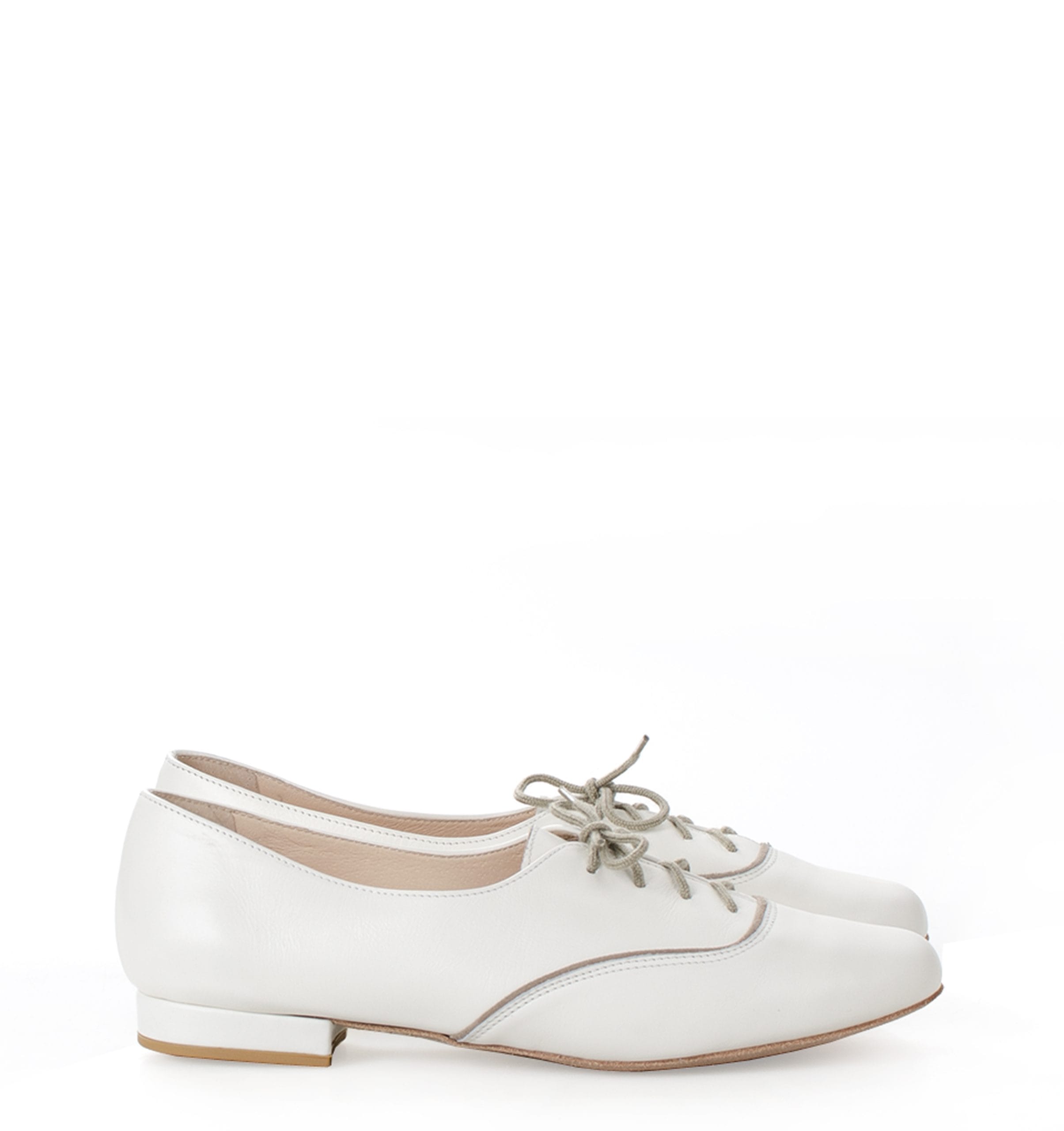 FLORES – kremowe buty treningowe na płaskim obcasie o wysokości 1,5 cm (mierzone dla rozmiaru 37). Przeznaczone do ćwiczeń tanga i innych tańców. Skórzana, welurowa podeszwa jest elastyczna i miękka, bez usztywnienia. FLORES to wygodne, sznurowane buty do treningu tanecznego.
