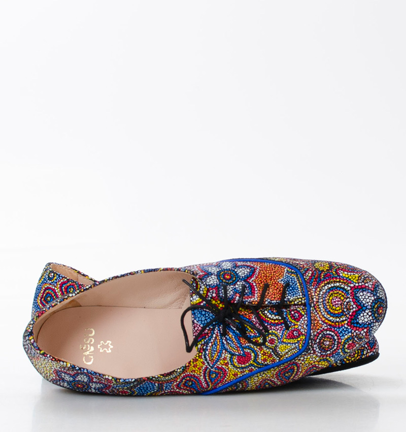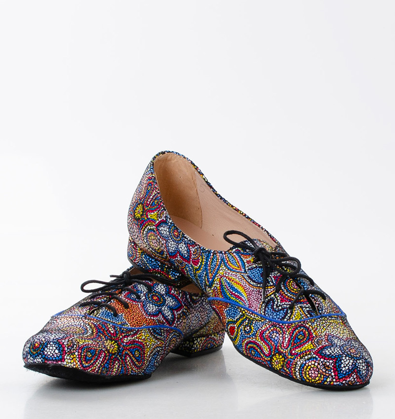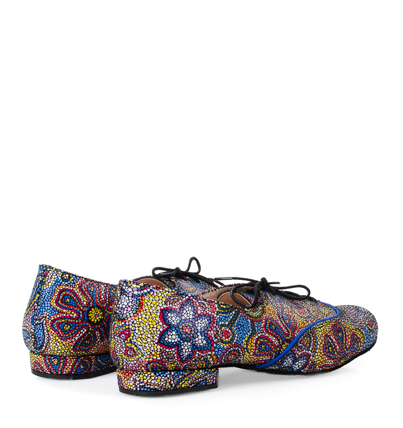 FLORES – buty treningowe na płaskim obcasie o wysokości 1,5 cm (mierzone dla rozmiaru 37) w kolorze niebieskim i wzorze w kolorowe kwiaty. Przeznaczone do ćwiczeń różnego rodzaju tańców. Skórzana podeszwa jest elastyczna i miękka, bez usztywnienia. FLORES to wygodne, sznurowane buty do treningu tanecznego.