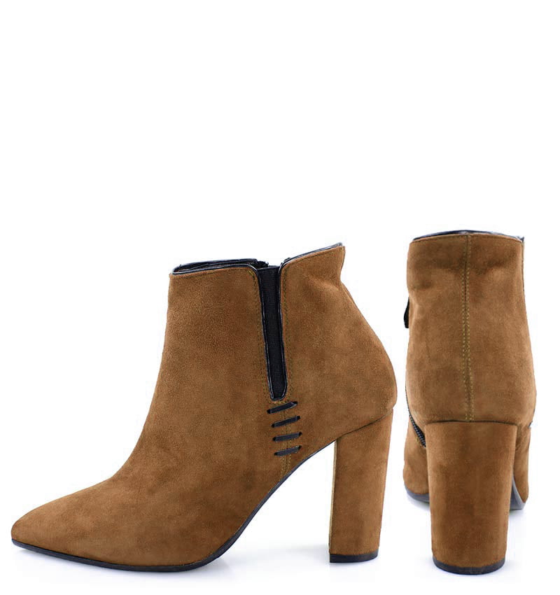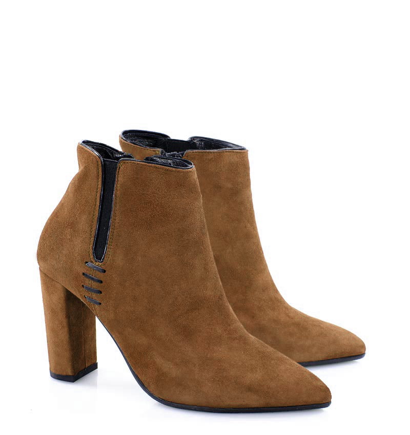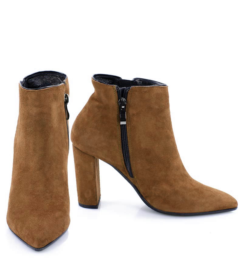 FRANCES – Brązowe botki jesienno – zimowe na 9,5 cm słupku (wysokość obcasa jest mierzona w rozmiarze 37). Czubek w szpic, zapinane na zamek . Buty wykonane z naturalnej skóry welurowej układającej się do stopy. Średnia wysokość obcasa sprawia, że są to wygodne botki. Tęgość butów: F 1/2. Wnętrze butów jest nieocieplone, wkładka ze skóry naturalnej.