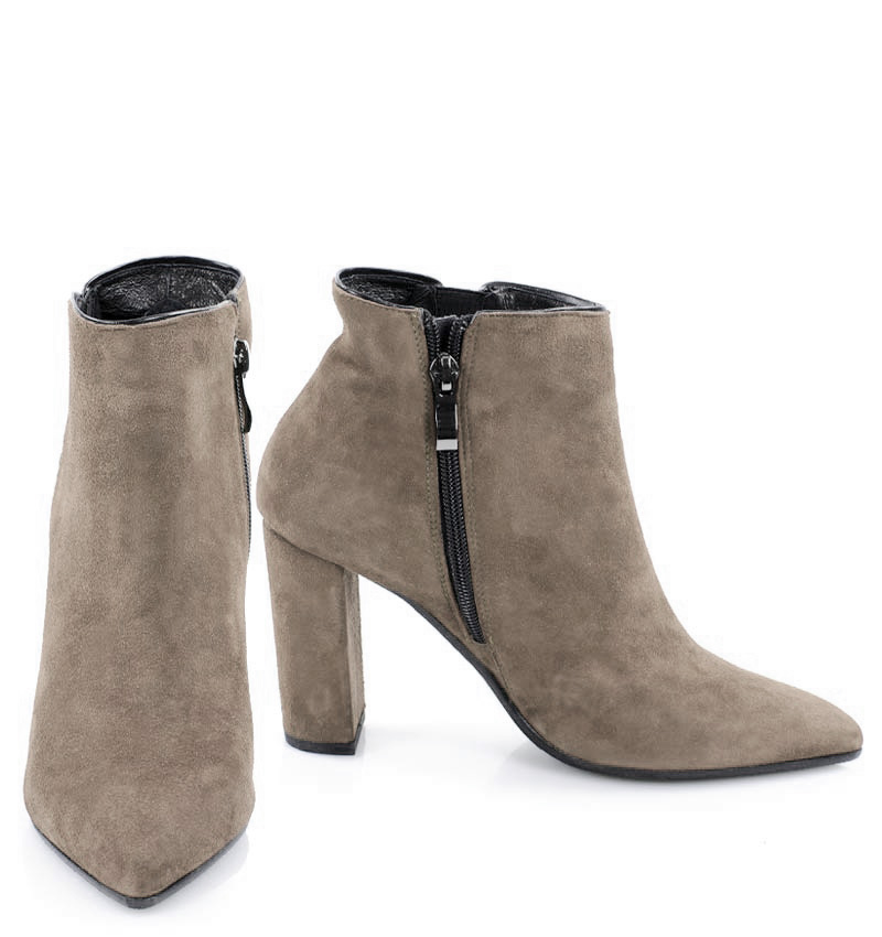 FRANCES – beżowe botki jesienno zimowe na 9,5 cm słupku (wysokość obcasa jest mierzona w rozmiarze 37). Czubek w szpic, zapinane na zamek . Buty wykonane z naturalnej skóry welurowej układającej się do stopy. Średnia wysokość obcasa sprawia, że są to wygodne botki. Tęgość butów: F 1/2. Wnętrze butów jest nieocieplone, wkładka ze skóry naturalnej.