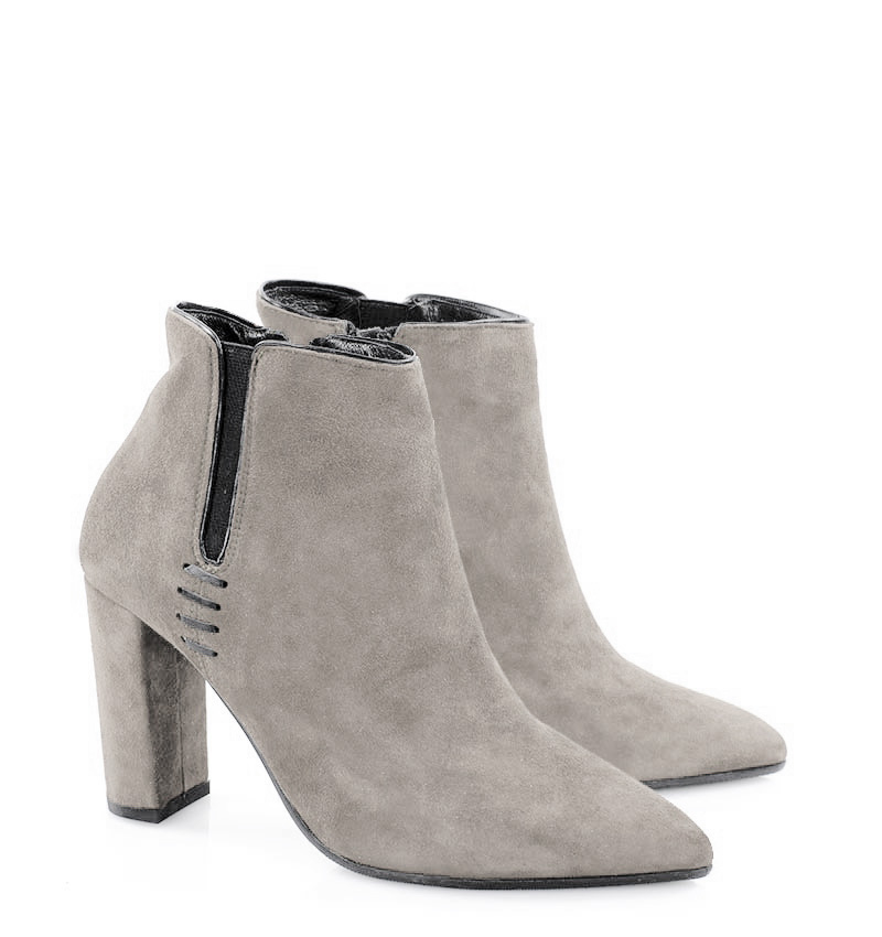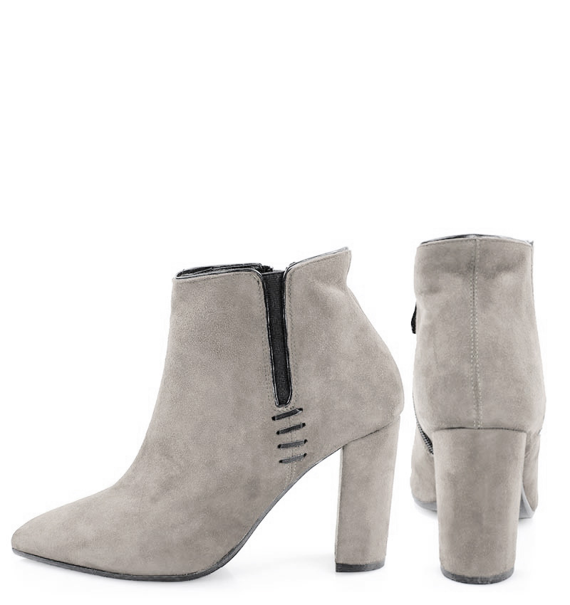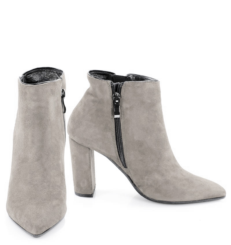 FRANCES – Jasno szare botki jesienno zimowe na 9,5 cm słupku (wysokość obcasa jest mierzona w rozmiarze 37). Czubek w szpic, zapinane na zamek . Buty wykonane z naturalnej skóry zamszowej układającej się do stopy. Średnia wysokość obcasa sprawia, że są to wygodne botki. Tęgość butów: F 1/2. Wnętrze butów jest nieocieplone, wkładka ze skóry naturalnej.