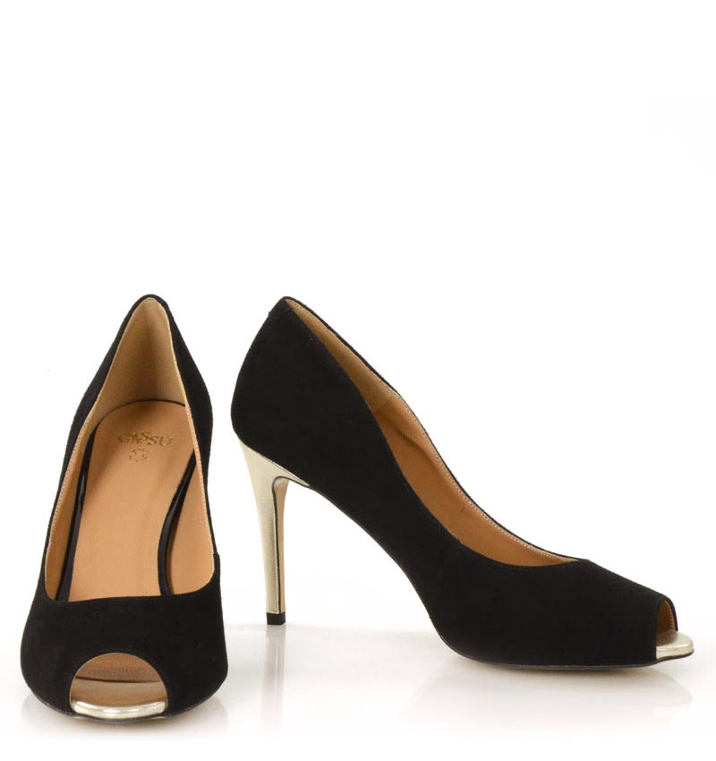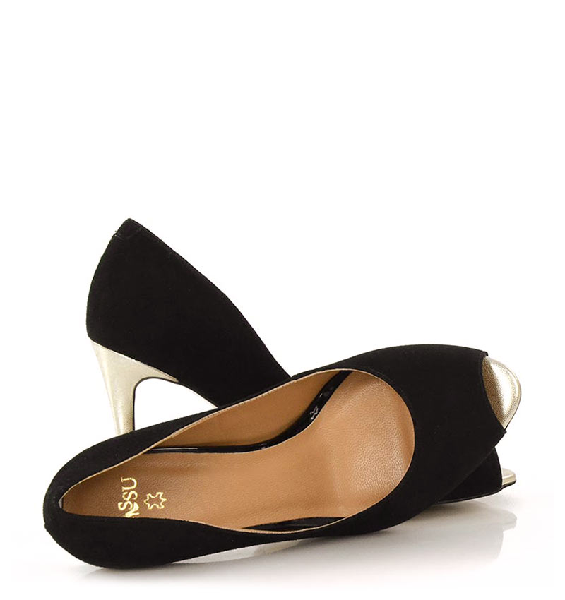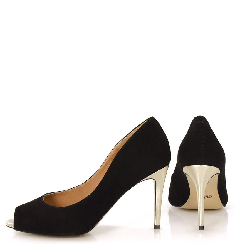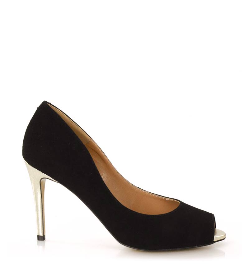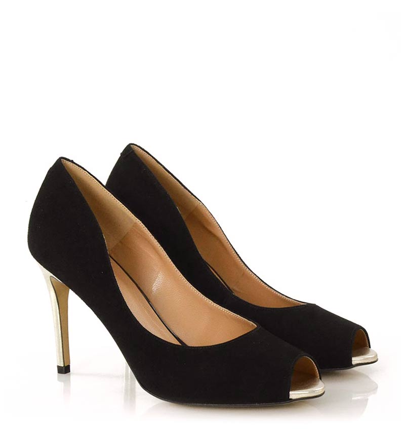 GABRIELLE –  Czarne szpilki na 9 cm obcasie, odkrytym palcem. Wykonane z naturalnej skóry licowej. Delikatnie odsłonięty palec i wysokiej wysokości obcas, sprawia, że czółenka te są wygodne. Wysokość obcasa jest mierzona w rozmiarze 37. Cholewka wykonana z naturalnej skóry zamszowej. Tęgość butów: F1/2. Wnętrze butów i wkładka wykonane są ze skóry naturalnej.