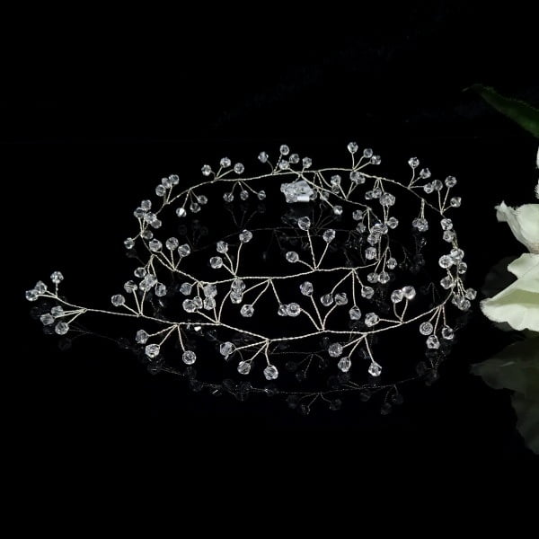 Stroik do włosów – Pięknie wyplecione szklane kryształki bicone oraz perełek, na druciku w kolorze jasnego srebra. Gałązka pięknie prezentuje się wpleciona w kok lub jako wianek . Doskonały dodatek ślubny jak i wieczorowy.