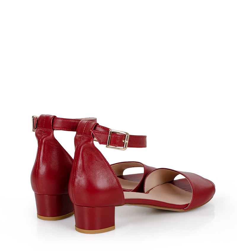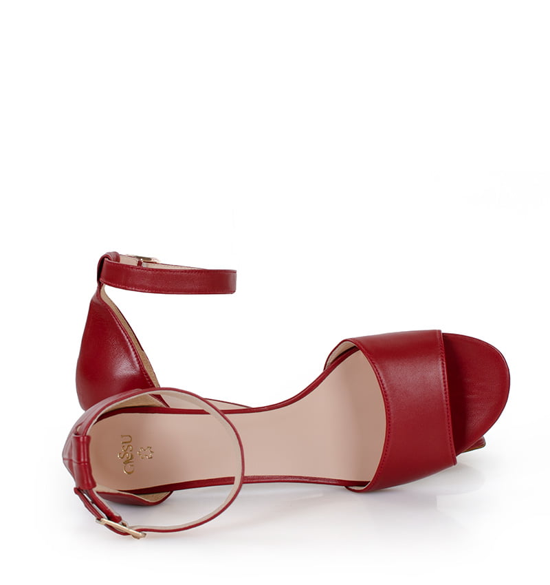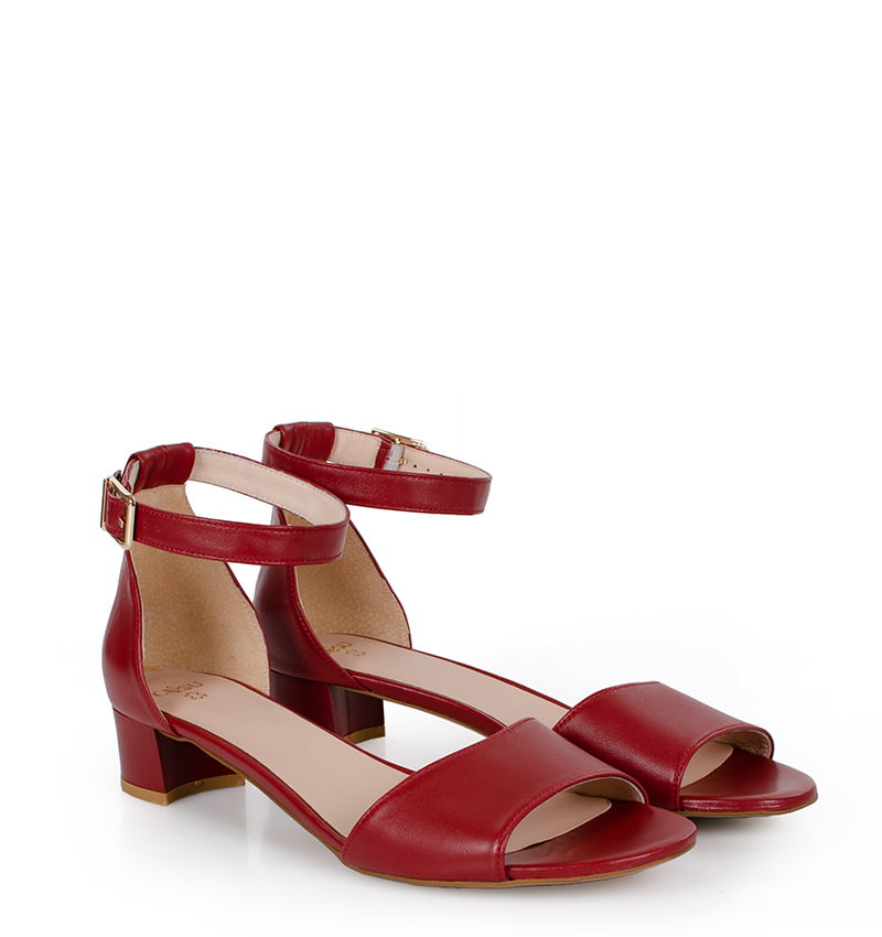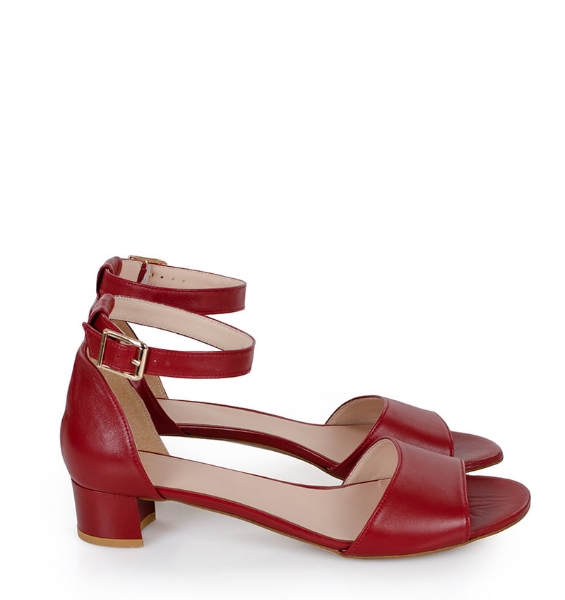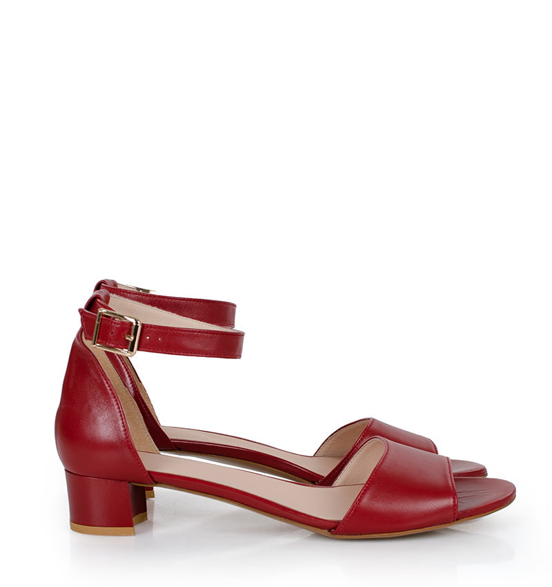 GINA – Eleganckie, czerwone sandały na niskim obcasie, wykonane z licowej skóry naturalnej. Obcas 3,5 cm (wysokość obcasa jest mierzona dla rozmiaru 37). Wygodne sandałki z zakryta piętą i paskiem wokół kostki. Tęgość butów to F 1/2. Czerwone sandały na małym obcasie są bardzo wygodne i zapewniają wysoki komfort noszenia.
