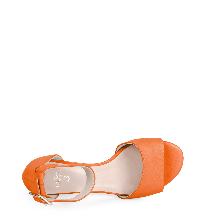 GINA – Eleganckie, pomarańczowe sandały na niskim obcasie, wykonane z licowej skóry naturalnej. Obcas 3,5 cm (wysokość obcasa jest mierzona dla rozmiaru 37). Wygodne sandałki z zakryta piętą i paskiem wokół kostki. Tęgość butów to F 1/2. Pomarańczowe sandały na małym obcasie są bardzo wygodne i zapewniają wysoki komfort noszenia.