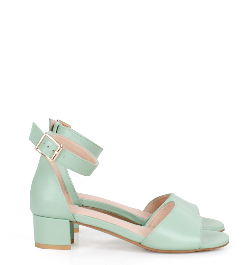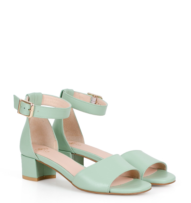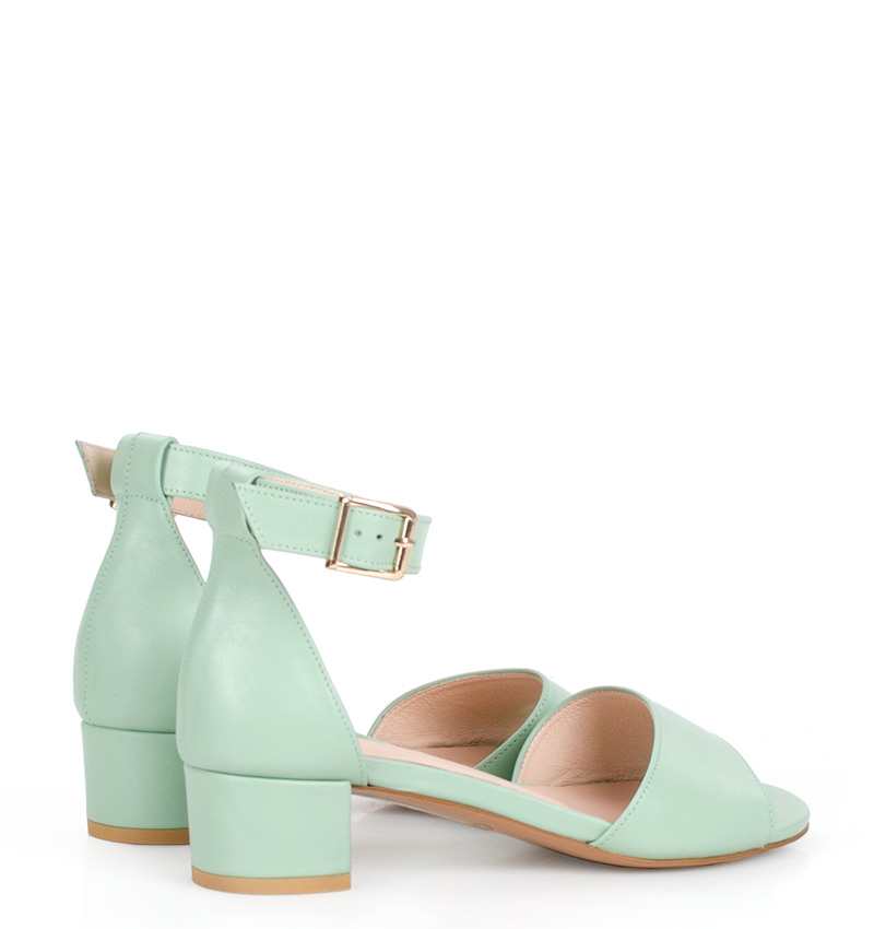 GINA –  Eleganckie, jasno zielone sandały na niskim obcasie, wykonane z licowej skóry naturalnej. Obcas 3,5 cm (wysokość obcasa jest mierzona dla rozmiaru 37). Wygodne sandałki z zakryta piętą i paskiem wokół kostki.  Tęgość butów to F 1/2. Miętowe sandały na małym obcasie są bardzo wygodne i zapewniają wysoki komfort noszenia.