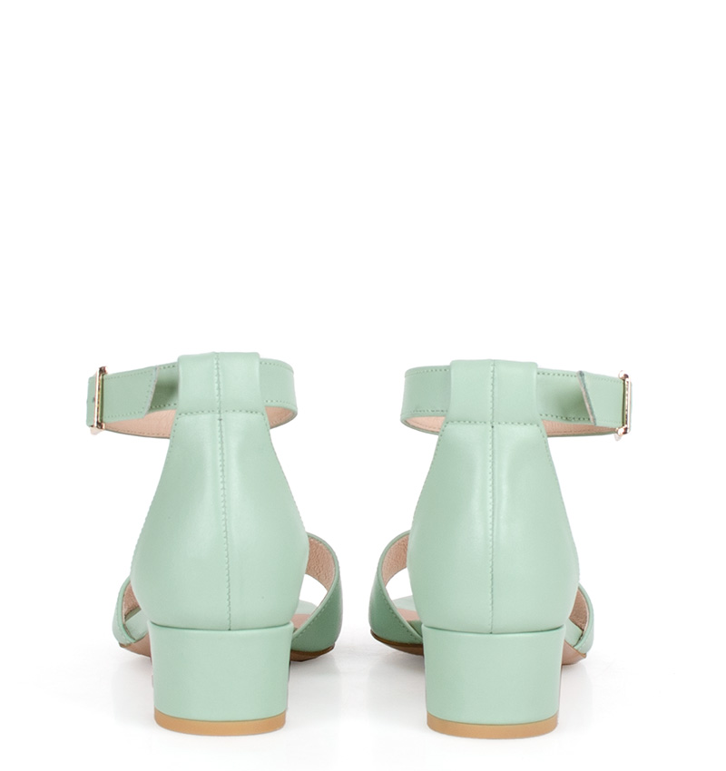 Te jasne zielone sandałki na niskim obcasie wykonywane są ręcznie, dzięki czemu istnieje możliwość indywidualnego dostosowania sandałek do nietypowych stóp