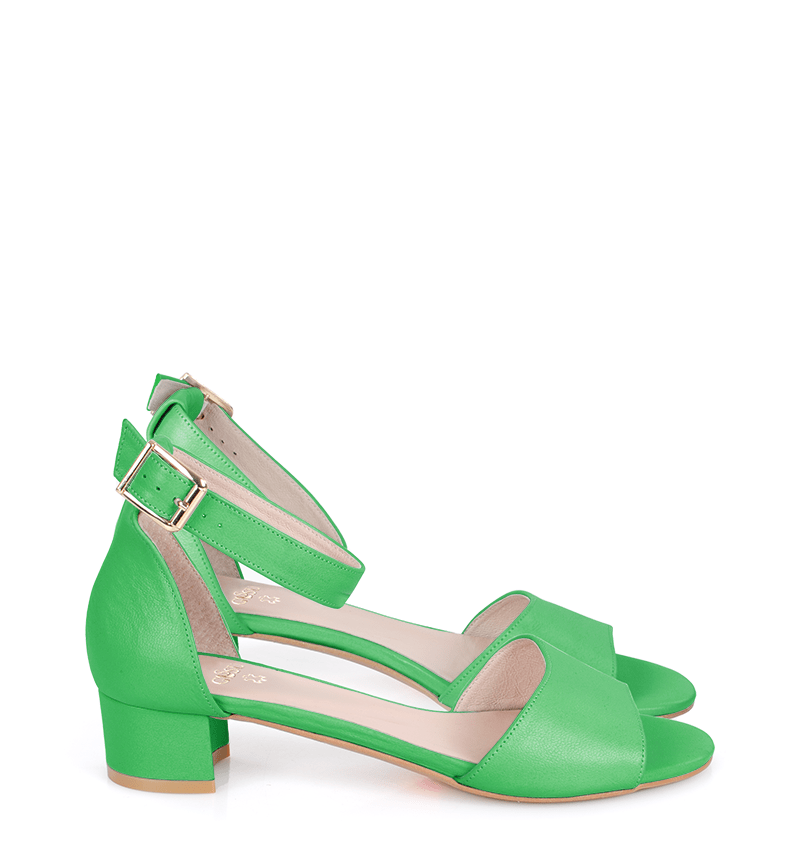 GINA –  Eleganckie, zielone sandały na niskim obcasie, wykonane z licowej skóry naturalnej. Obcas 3,5 cm (wysokość obcasa jest mierzona dla rozmiaru 37). Wygodne sandałki z zakryta piętą i paskiem wokół kostki.  Tęgość butów to F 1/2. Zielone sandały na małym obcasie są bardzo wygodne i zapewniają wysoki komfort noszenia.
