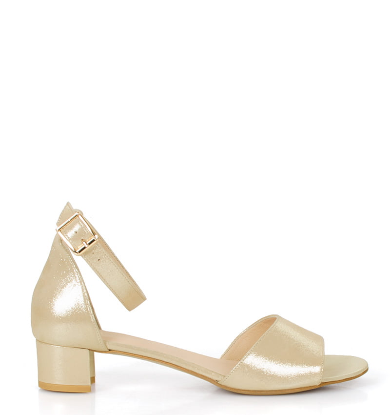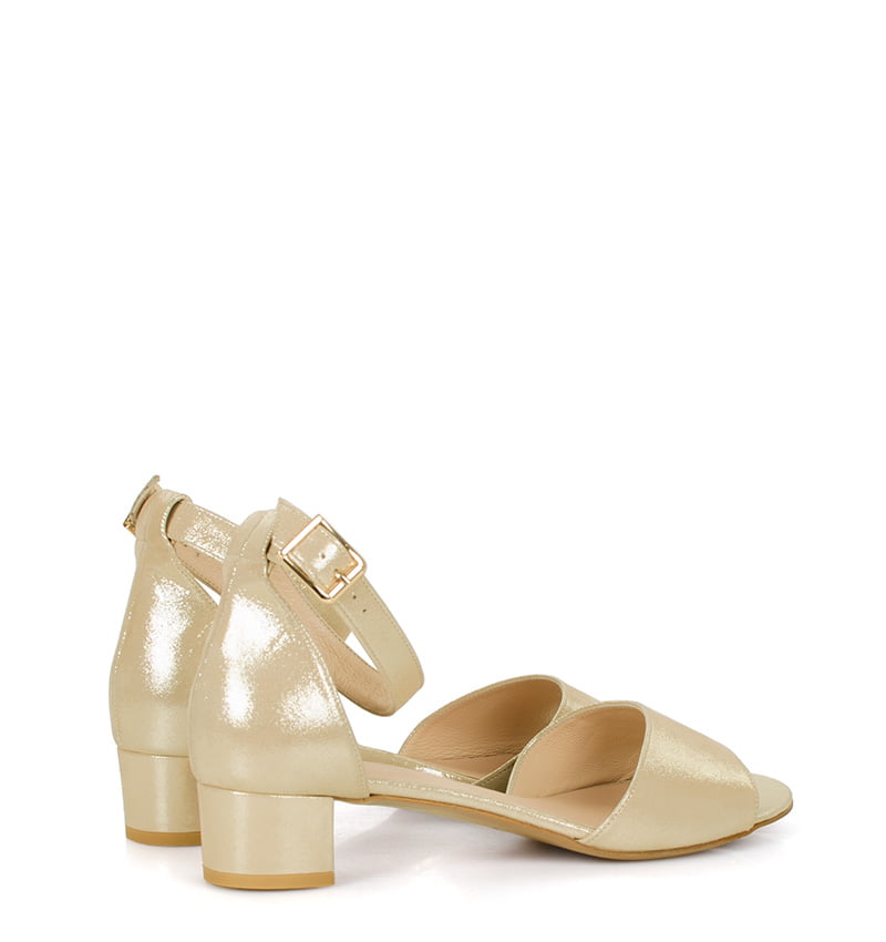 GINA – złote sandały na niskim obcasie, wykonane z satynowanej skóry naturalnej. Obcas 3,5 cm (wysokość obcasa jest mierzona dla rozmiaru 37). Wygodne sandałki z zakryta piętą i paskiem wokół kostki. Tęgość butów to F 1/2. Złote sandały na małym obcasie są bardzo wygodne i zapewniają wysoki komfort noszenia.