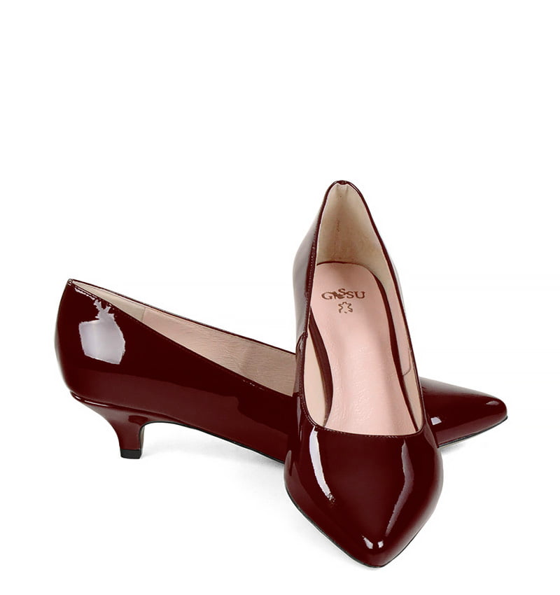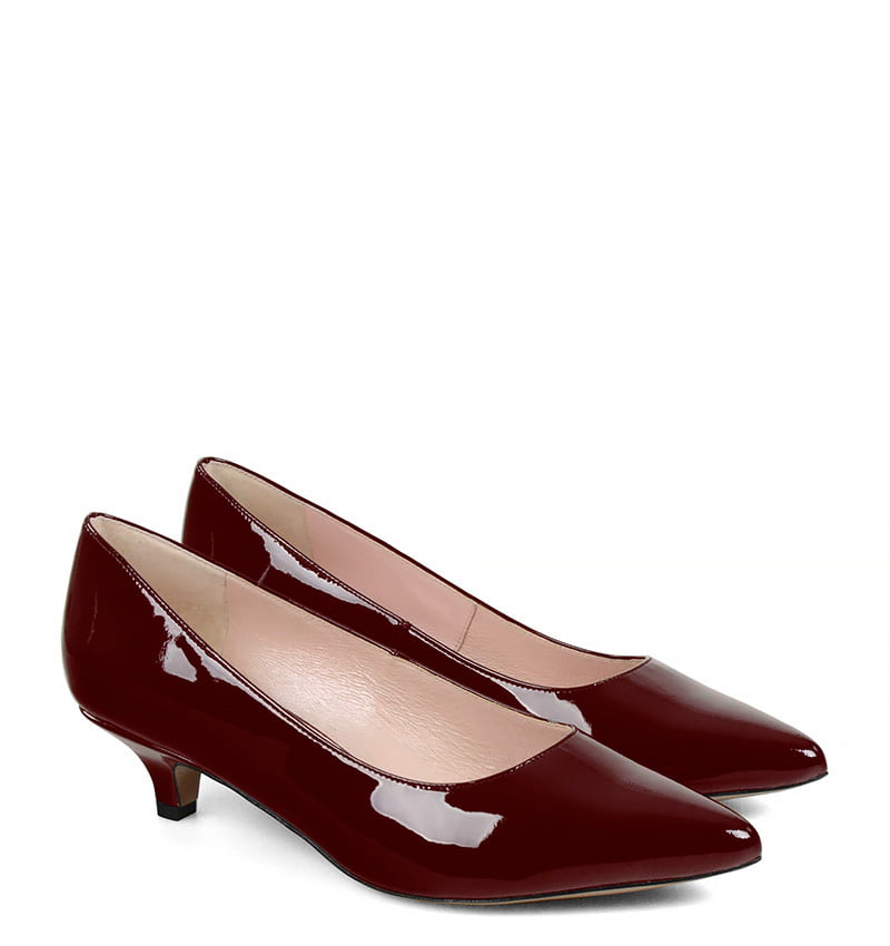 JESSICA – Bordowe niskie szpilki na 4 cm obcasie (wysokość obcasa jest mierzona w rozmiarze 37). Czubek w szpic. Buty wykonane z naturalnej skóry lakierowanej, układającej się do stopy. Niska wysokość obcasa sprawia, że są to bardzo wygodne czółenka na szpilce. Tęgość butów: G. Wnętrze butów i wkładka wykonane są ze skóry naturalnej.