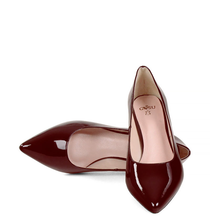 JESSICA – Bordowe niskie szpilki na kaczuszce z lakierowanej skóry