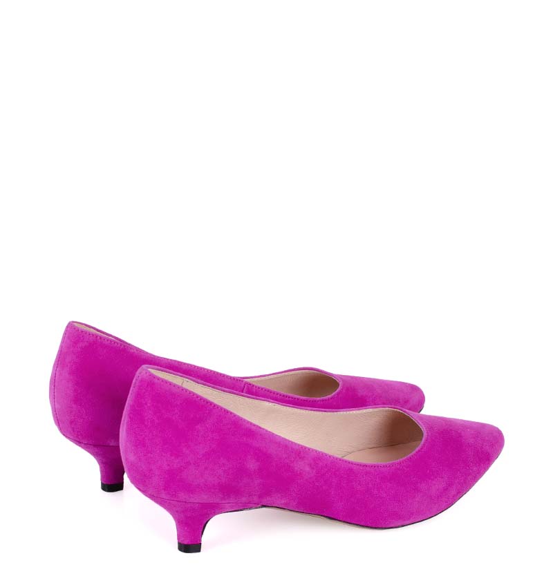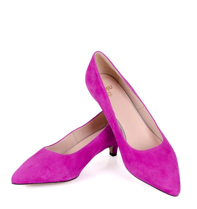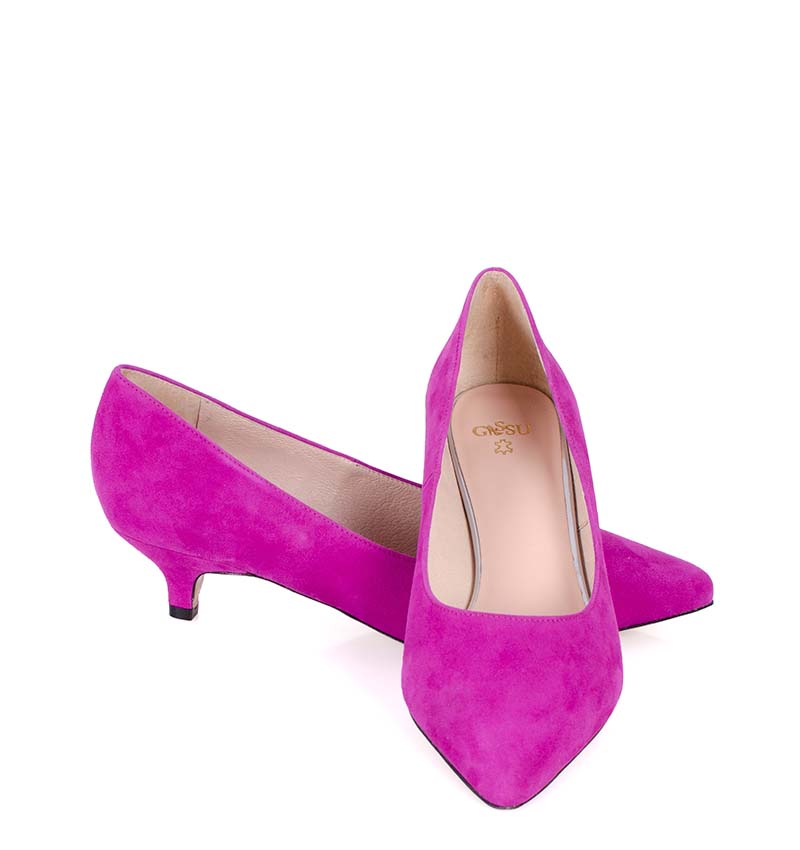 JESSICA –  Różowe (fuksja) niskie szpilki na 4 cm obcasie (wysokość obcasa jest mierzona w rozmiarze 37). Czubek w szpic. Buty wykonane z naturalnej skóry zamsz, układającej się do stopy. Niska wysokość obcasa sprawia, że są to bardzo wygodne czółenka na szpilce. Tęgość butów: G. Wnętrze butów i wkładka wykonane są ze skóry naturalnej.