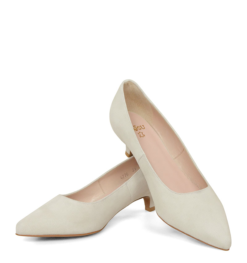 JESSICA –  Ecre niskie szpilki na 4 cm obcasie (wysokość obcasa jest mierzona w rozmiarze 37). Czubek w szpic. Buty wykonane z naturalnej skóry zamszowej, układającej się do stopy. Niska wysokość obcasa sprawia, że są to bardzo wygodne czółenka na szpilce. Tęgość butów: G. Wnętrze butów i wkładka wykonane są ze skóry naturalnej.