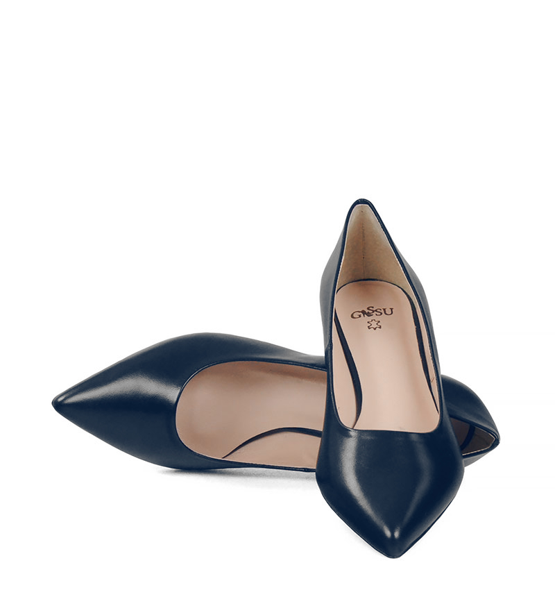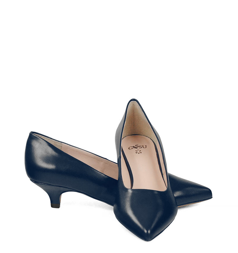 JESSICA – Granatowe niskie szpilki na 4 cm obcasie (wysokość obcasa jest mierzona w rozmiarze 37). Czubek w szpic. Buty wykonane z naturalnej skóry licowej, układającej się do stopy. Niska wysokość obcasa sprawia, że są to bardzo wygodne czółenka na szpilce. Tęgość butów: G. Wnętrze butów i wkładka wykonane są ze skóry naturalnej.