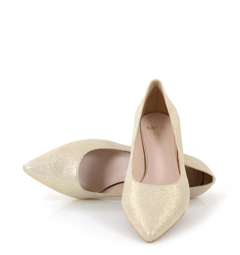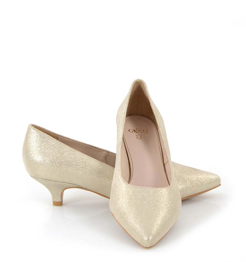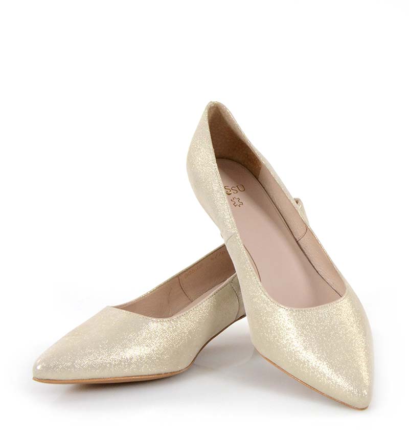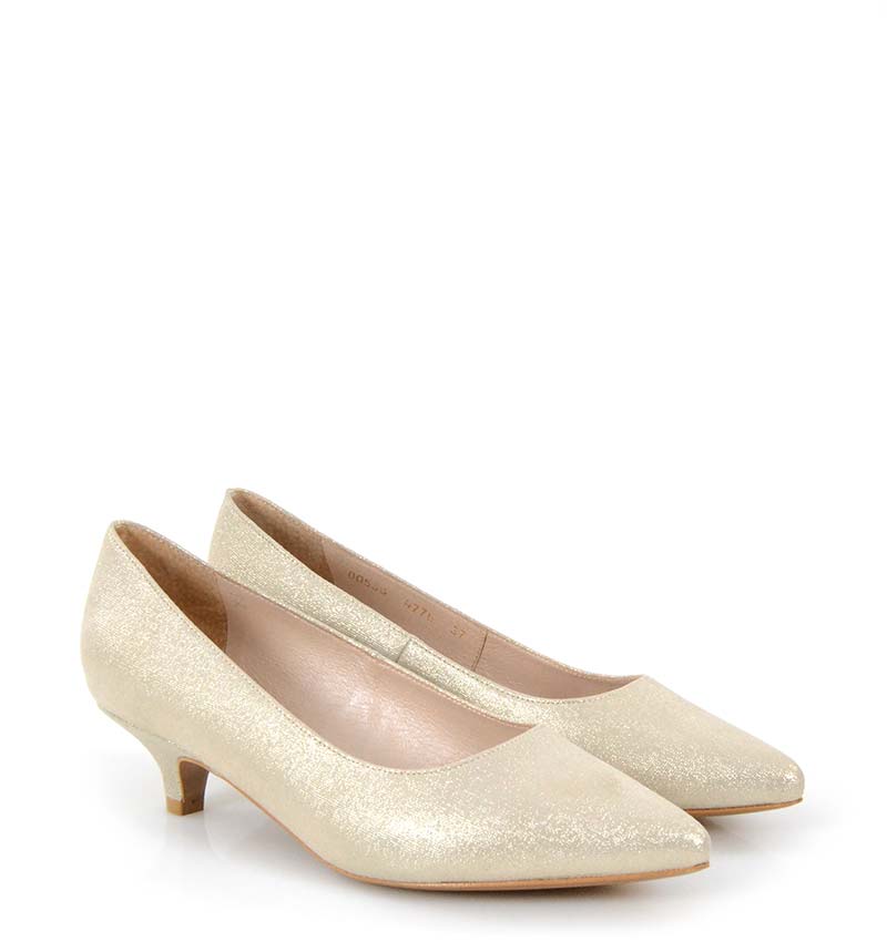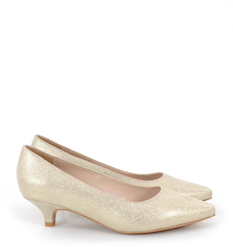 JESSICA – Jasno złote niskie szpilki na 4 cm obcasie (wysokość obcasa jest mierzona w rozmiarze 37). Czubek w szpic. Buty wykonane z naturalnej skóry satynowej, układającej się do stopy. Niska wysokość obcasa sprawia, że są to bardzo wygodne czółenka na szpilce. Tęgość butów: G. Wnętrze butów i wkładka wykonane są ze skóry naturalnej.