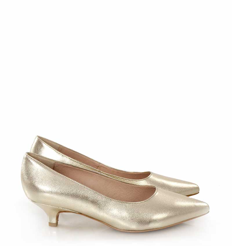 JESSICA – Jasno złote niskie szpilki na 4 cm obcasie (wysokość obcasa jest mierzona w rozmiarze 37). Czubek w szpic. Buty wykonane z naturalnej skóry licowej, układającej się do stopy. Niska wysokość obcasa sprawia, że są to bardzo wygodne czółenka na szpilce. Tęgość butów: G. Wnętrze butów i wkładka wykonane są ze skóry naturalnej.