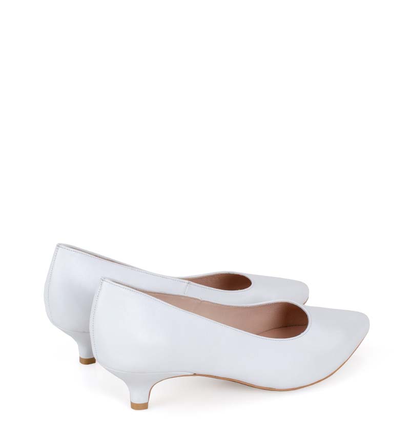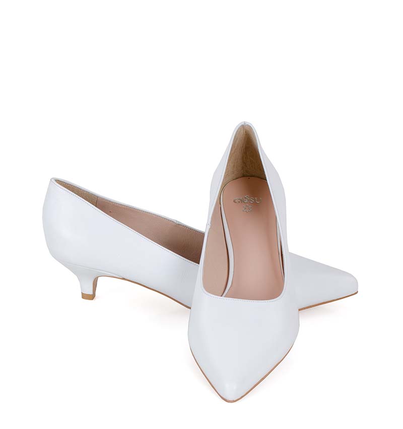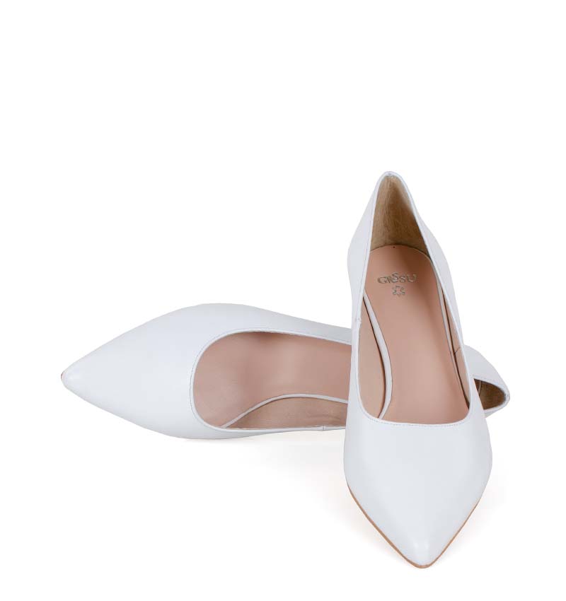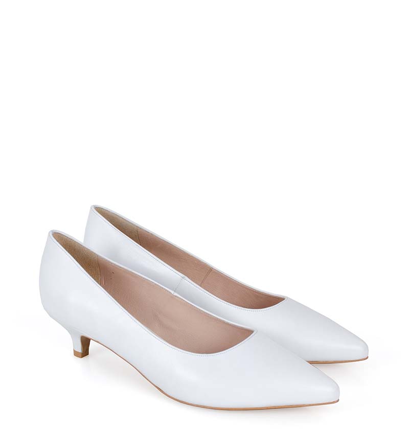 JESSICA –  białe niskie szpilki na 4 cm obcasie (wysokość obcasa jest mierzona w rozmiarze 37). Czubek w szpic. Buty wykonane z naturalnej skóry licowej, układającej się do stopy. Niska wysokość obcasa sprawia, że są to bardzo wygodne czółenka na szpilce. Tęgość butów: G. Wnętrze butów i wkładka wykonane są ze skóry naturalnej.