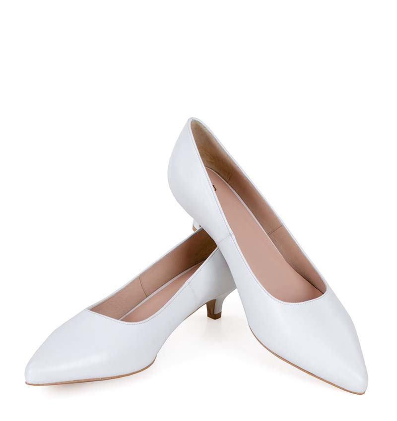 Te białe szpilki na niskim obcasie wykonywane są ręcznie, dzięki czemu istnieje możliwość indywidualnego dostosowania. Nietypowe stopy? Zadzwoń - zrobimy czółenka na indywidualne zamówienie.
