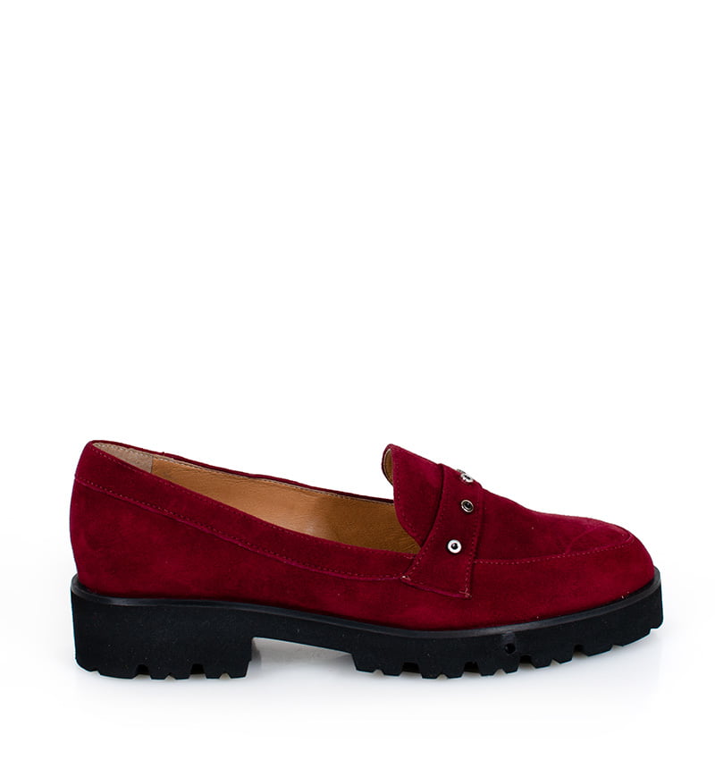 JOANNA –  Ciemne, czerwone półbuty na czarnym „traperku”, w stylu mokasyn. Buty wykonane z naturalnej skóry zamszowej. Niski obcas gwarantuje wygodne użytkowanie nawet przez cały dzień. Tęgość butów: F 1/2. Wnętrze butów i wkładka wykonane są ze skóry naturalnej.