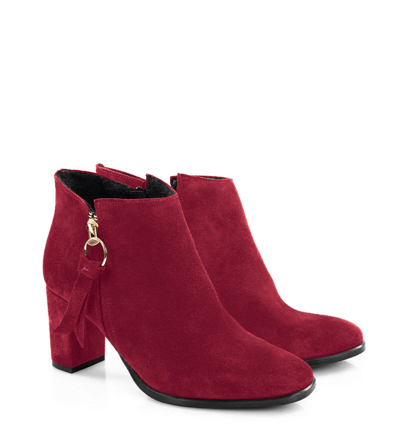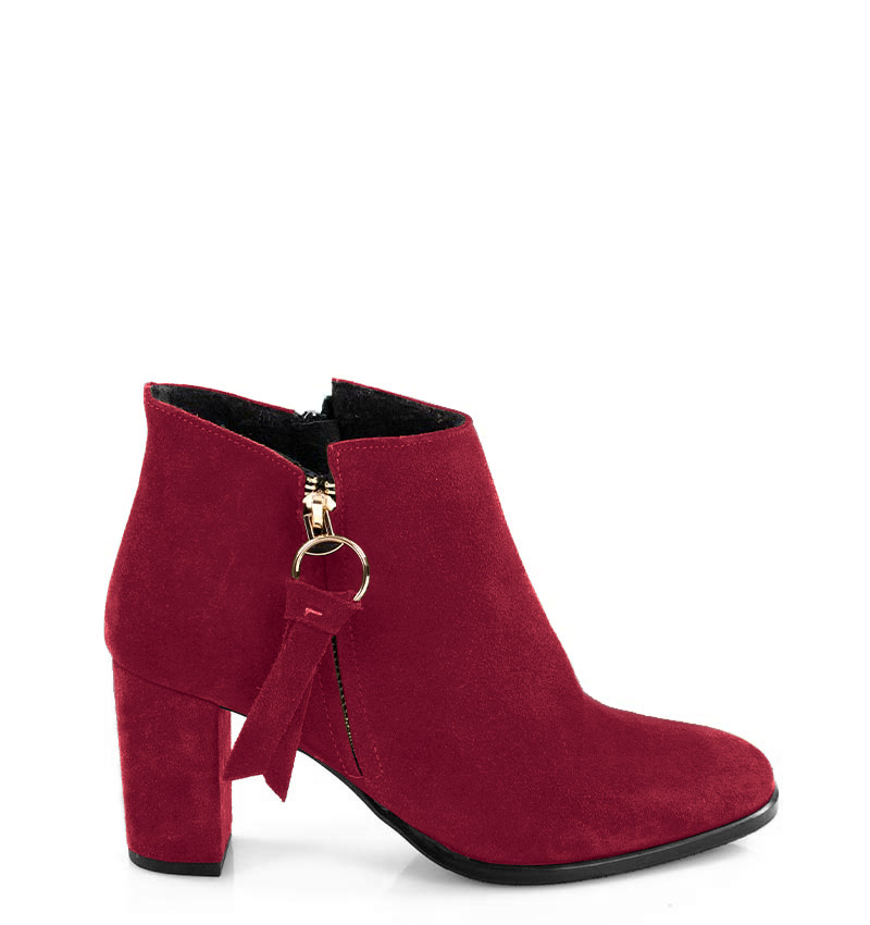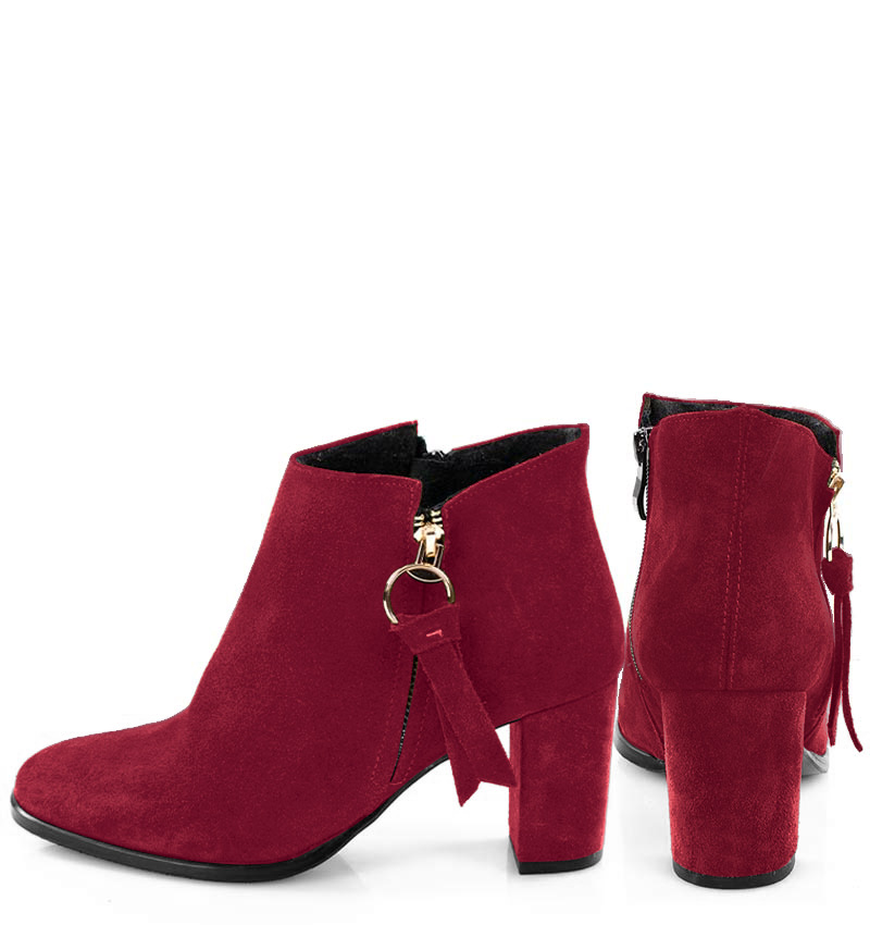 Bordowa skóra zamszowa, ma doskonałe właściwości dopasowywania się do stopy. Botki są łatwe w utrzymaniu w czystości i konserwacji za pomocą środków do nubuku, weluru i zamszu.