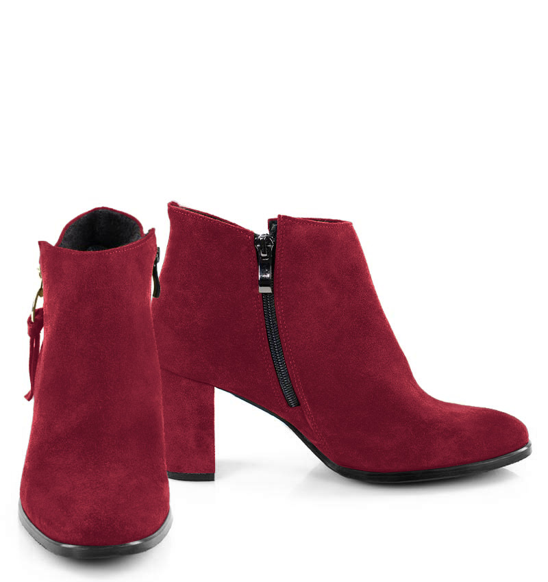 JUDITH – Bordowe botki do kostki, na 7,5 cm słupku. (wysokość obcasa jest mierzona w rozmiarze 37). Botki wykonane z zamszowej skóry naturalnej. Czubek w zaokrąglony. Średnia wysokość obcasa sprawia, że są to wygodne botki na słupku. Tęgość butów: G. Wnętrze butów jest lekko ocieplone cienkim kocem obuwniczym.