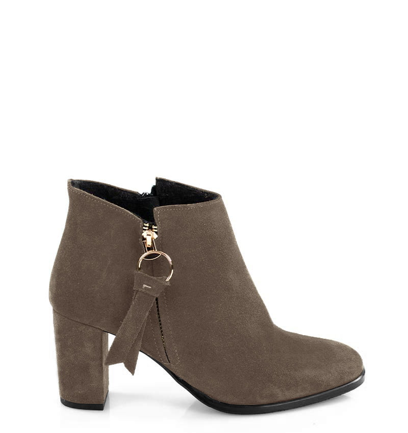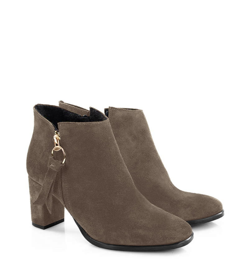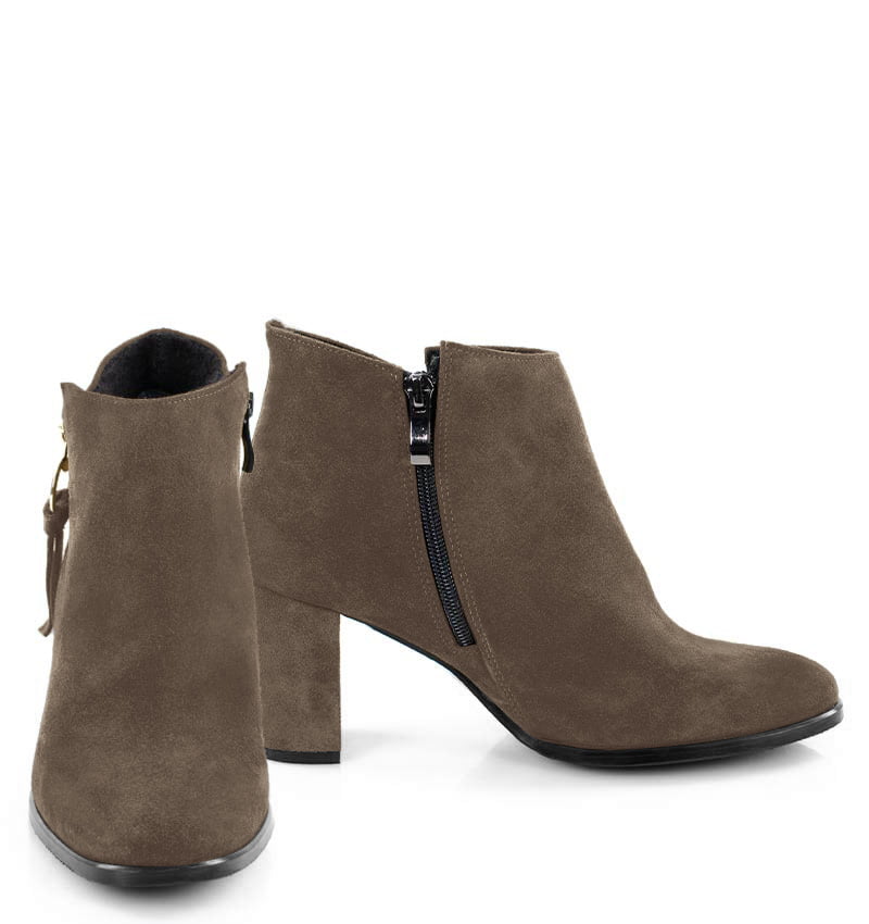 JUDITH – Ciemno beżowe botki do kostki, na 7,5 cm słupku. (wysokość obcasa jest mierzona w rozmiarze 37). Botki wykonane z welurowej skóry naturalnej. Czubek w zaokrąglony. Średnia wysokość obcasa sprawia, że są to wygodne botki na słupku. Tęgość butów: G. Wnętrze butów jest lekko ocieplone cienkim kocem obuwniczym.