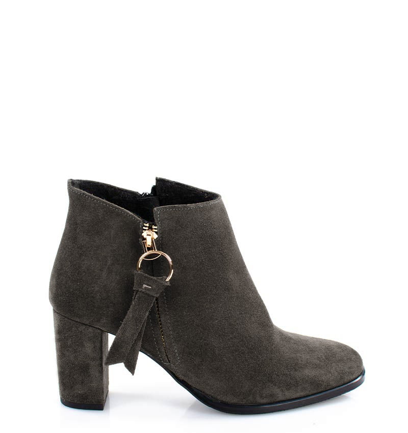 JUDITH – Ciemno szare botki do kostki, na 7,5 cm słupku. (wysokość obcasa jest mierzona w rozmiarze 37). Botki wykonane z welurowej skóry naturalnej. Czubek w zaokrąglony. Średnia wysokość obcasa sprawia, że są to wygodne botki na słupku. Tęgość butów: G. Wnętrze butów jest lekko ocieplone cienkim kocem obuwniczym.